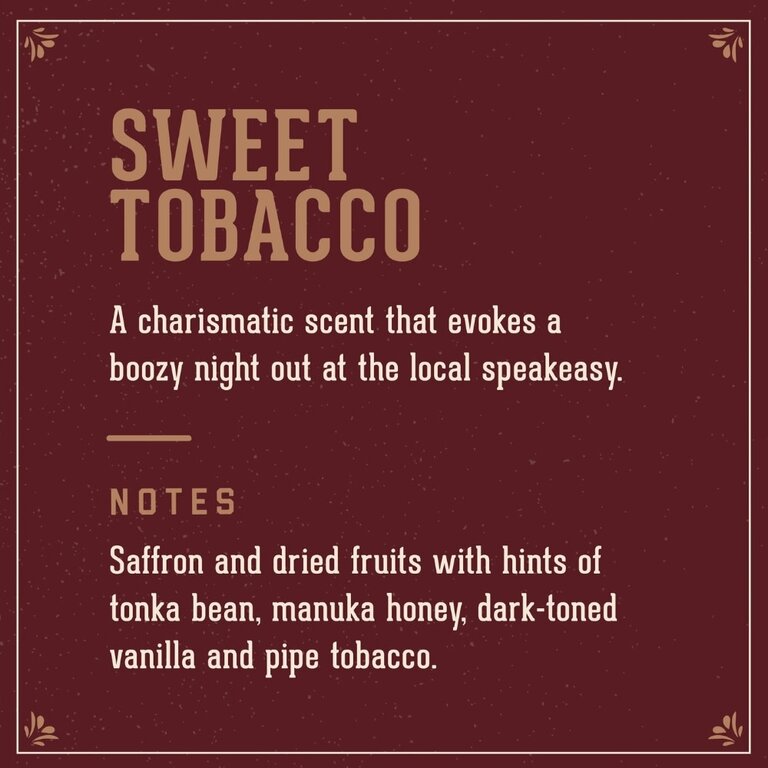 - Parfum Sweet Tobacco : Notes chaudes et sophistiquées de tabac doux, vanille et bois.