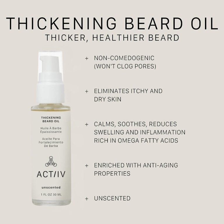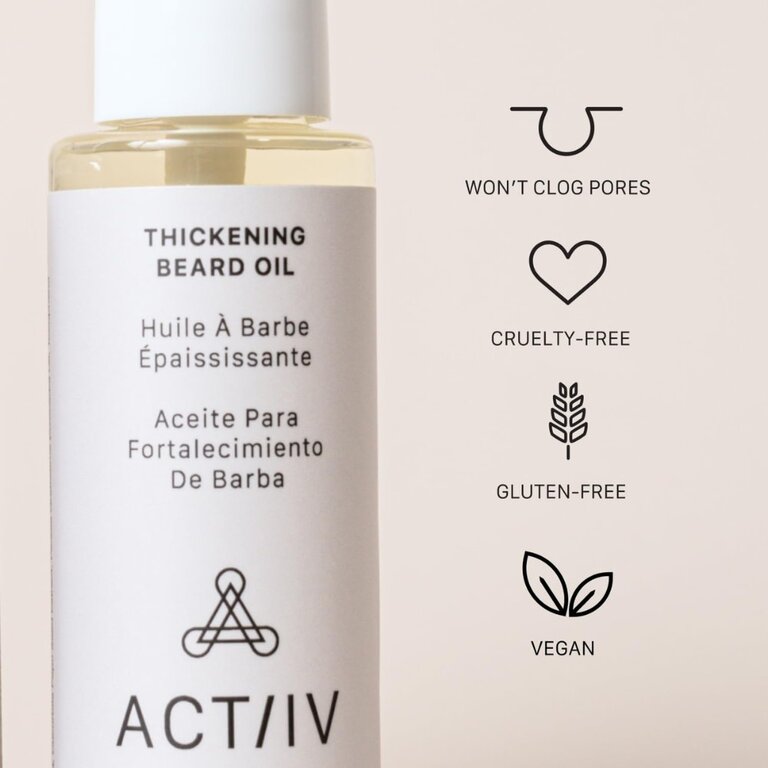 L'huile à barbe épaississante sans parfum "Unscented Thickening Beard Oil" d'Actiiv Hair Science est formulée avec un mélange unique d'huiles naturelles qui jouent un rôle actif dans la croissance et la nutrition des poils du visage, favorisant une croissance de la barbe plus épaisse et plus fournie. Sa formule naturelle enrichie d'huile de ricin, d'huile de carthame, d'huile d'amande douce, d'oryza sativa, et d'huile de jojoba est nourrissante et non comédogène, en plus d'aider à apaiser et à réduire l'enflure, l'inflammation et l'irritation de la peau.