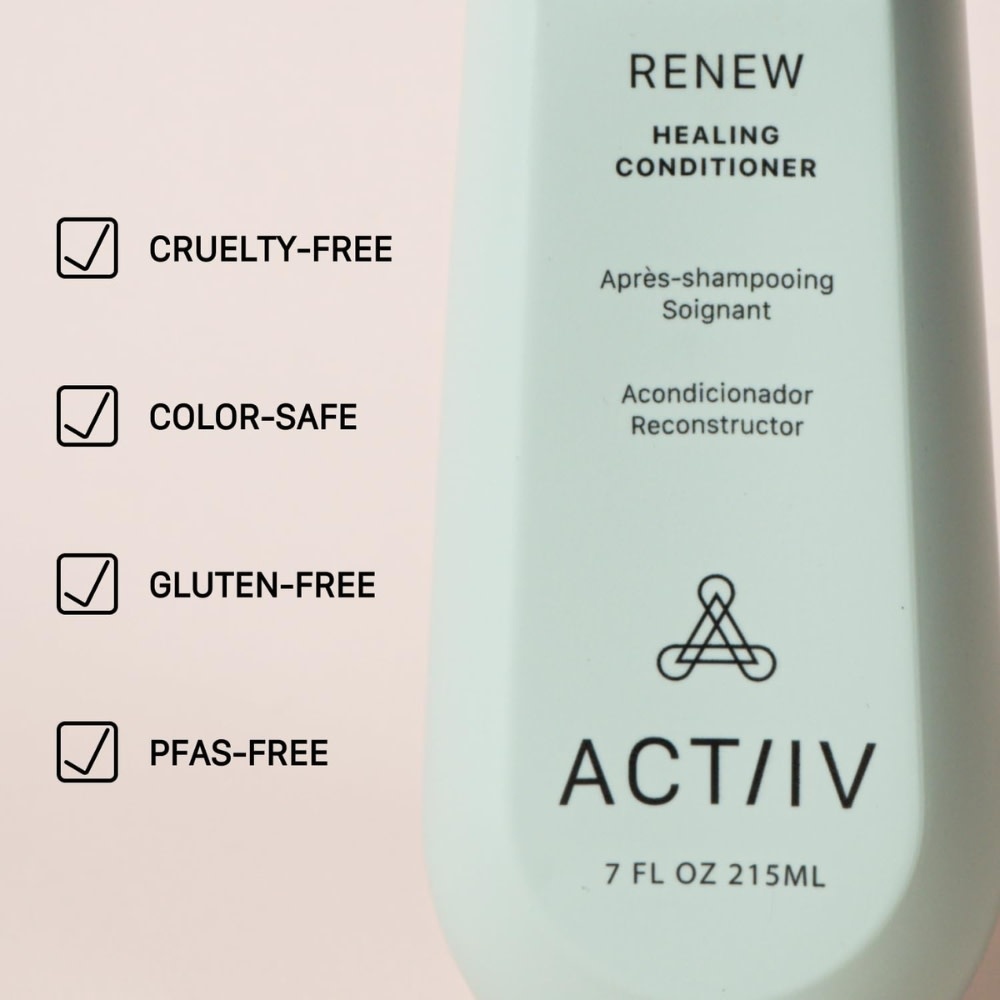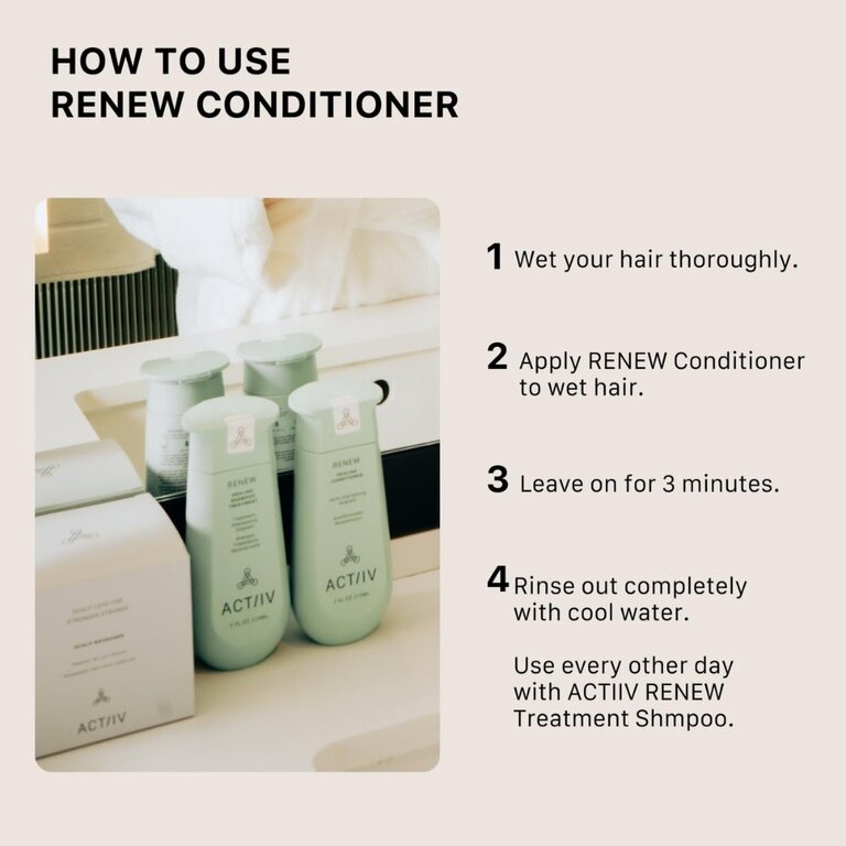 Le revitalisant soignant "Renew" d'Actiiv Hair Science est la deuxième étape du système "Renew" pour des cheveux plus sains et plus forts. Il utilise une forte concentration d’extrait d’aloe vera pour hydrater les cheveux, augmenter leur brillance et leur force. Sa formule aide à restaurer et réparer les cheveux secs, abîmés et cassants pour favoriser des cheveux plus équilibrés, moins vulnérables aux pointes fourchues et à la casse. Il apaise l’inflammation et l’irritation du cuir chevelu et peut même aider à soulager un cuir chevelu squameux et sec.