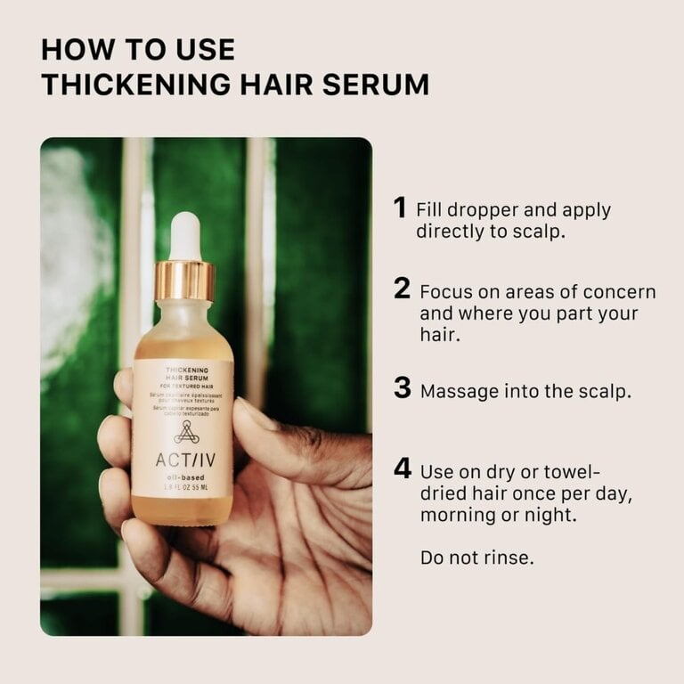 Le sérum capillaire épaississant à base d'huile "Oil-Based Thickening Hair Serum" d'Actiiv Hair Science favorise des cheveux plus épais et plus fournis, pour augmenter la densité, l'épaisseur et le volume des cheveux texturés et crépus. Ce sérum capillaire nourrissant aide à prévenir la casse des cheveux en renforçant le follicule pileux et la tige capillaire, diminuant ainsi la chute de cheveux. Les cheveux sont hydratés, plus brillants et plus abondants.