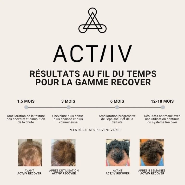 On constate une réduction importante de l'amincissement et de la chute des cheveux entre 2 et 6 semaines. La densité et la couverture commencent à se restaurer en 3 mois. Les résultats maximaux sont généralement observés entre 9 et 24 mois, en fonction de la gravité de la perte de cheveux, avant de débuter Actiiv.