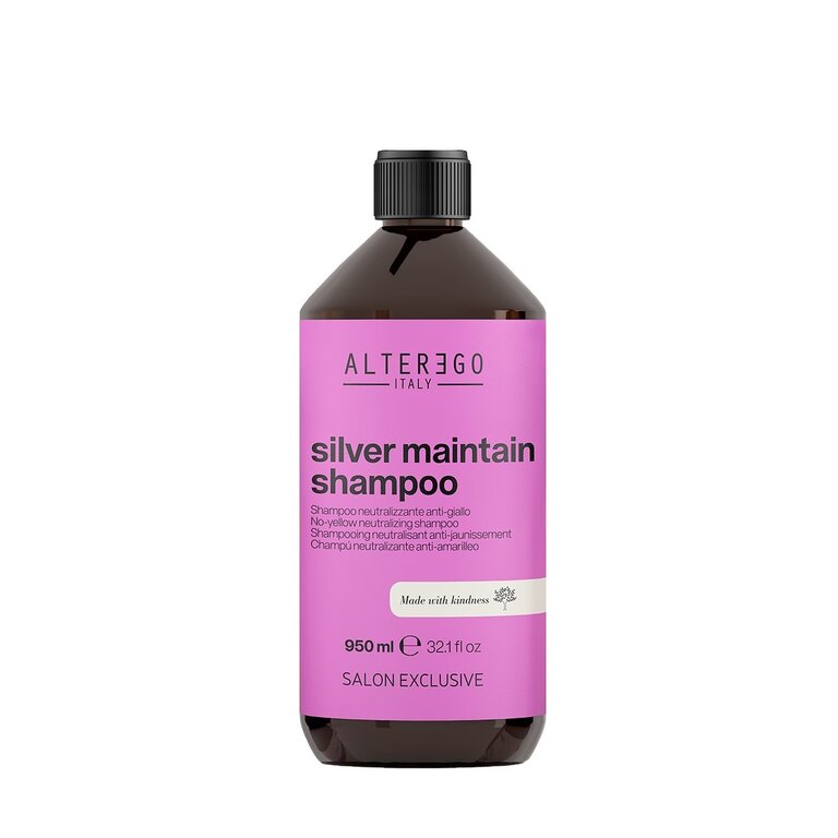 Le shampoing anti-jaune "ChromEgo Silver Maintain" d'Alterego Italy enrichie en puissants pigments violets neutralise efficacement les reflets jaunes indésirables jusqu'à 5 semaines. La couleur blonde sera non seulement extrêmement lumineuse, brillante et intense, mais également purifiée de tout ton indésirable. La fibre capillaire est renforcée et revitalisée, pour des cheveux doux et soyeux.