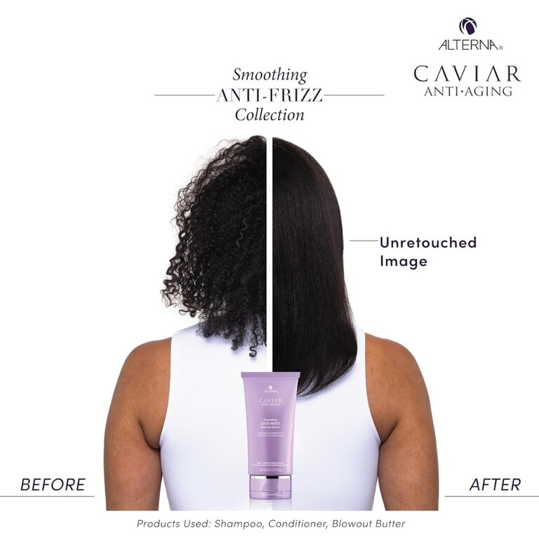 Le beurre lissant anti-frisottis "Anti-Frizz Blowout Butter" d'Alterna offre une formule crème-huile qui lisse et dompte les les cheveux indisciplinés et crépus en plus de combattre les effets indésirables causés par l'humidité. Sa formule infusée au caviar botanique et d'un complexe anti-humidité et anti-âge hydrate intensément, augmente la souplesse et l'éclat, pour des cheveux faciles à coiffer. Enrichie d'huile de carthame et de beurre de Murumuru, cette crème fournit une protection thermique jusqu'à 450°F/232°C, réduit le temps de séchage à l'air libre de 40% et diminue de 80% les frisottis jusqu'à 72 heures. Elle laisse les cheveux souples, contrôlés, rajeunis et brillants.