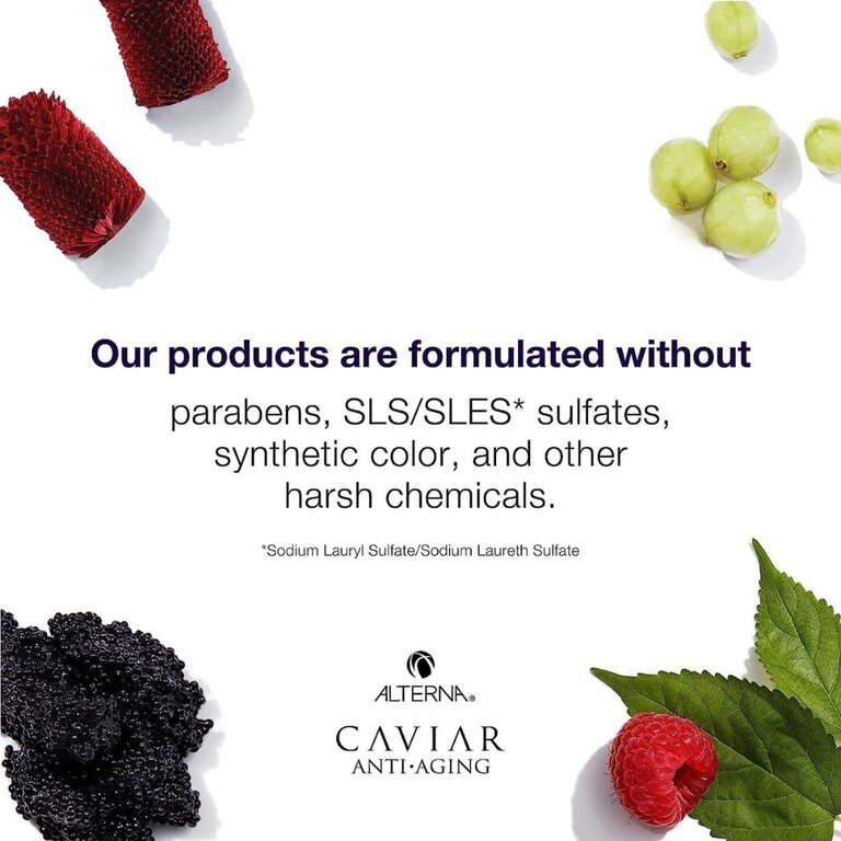 - Extrait de caviar : L'une des sources les plus riches de la nature en acides gras oméga-3, l'extrait de caviar redonne hydratation, élasticité et brillance aux cheveux tandis que les vitamines A, C et D protègent les cheveux des dommages futurs. L'extrait de caviar pur non menacé issu d'esturgeons de Sibérie vivant dans le Sud de la France est au cœur des formules d'Alterna. Ils sont récoltés durablement dans des conditions maîtrisées. Un processus d'extraction spécial capture la nutrition opulente à l'intérieur des perles de caviar crues. Le caviar aide à inverser les signes du vieillissement et à protéger des dommages futurs.