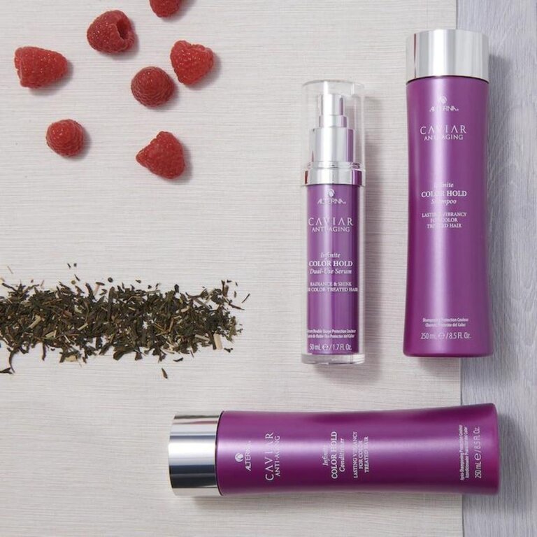 Le sérum double usage protection couleur "Infinite Color Hold" d'Alterna est un sérum innovant qui peut être utilisé comme traitement sans rinçage pour fournir une défense contre les rayons UV nocifs, augmenter la brillance et contrôler les frisottis indésirables. Il peut aussi être mélangé à n'importe quel revitalisant d'Alterna pour le modifier en masque protecteur de couleur, optimisant le niveau de conditionnement et d'éclat. Sa formule enrichie du complexe "Dual-Capture" régénère l'hydratation tout en réduisant l'affadissement de la couleur grâce à son mélange unique d'huile de feuille de framboisier rouge et d'huile de graine de tournesol.