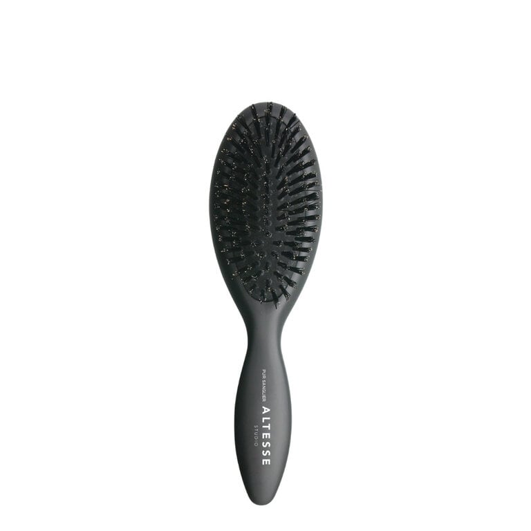 Altesse Studio décline son expertise dans cette brosse ovale petite dont les poils de sanglier véritables subliment la texture et l'éclat des cheveux. Sa conception artisanale française se traduit par un polissage à la main et une implantation technique des poils, favorisant une pénétration profonde de la chevelure. Cet accessoire haut de gamme offre un lissage organique supérieur et préserve la santé des pointes en répartissant idéalement les huiles protectrices naturelles.
