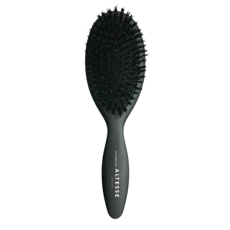 La brosse ovale grande de la maison Altesse Studio utilise l'excellence du pur sanglier pour transformer le brossage en un véritable rituel de lissage et de brillance. Sa conception artisanale française se traduit par un polissage à la main et une implantation technique des poils, favorisant une pénétration profonde de la chevelure. Cet outil haut de gamme maximise le lissage naturel et renforce la vitalité des mèches grâce à une répartition optimale des huiles naturelles.