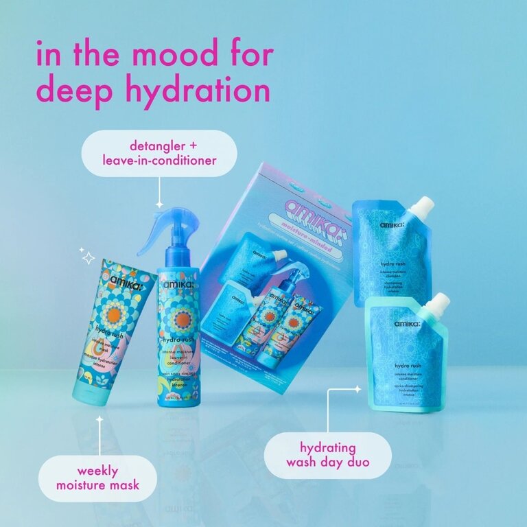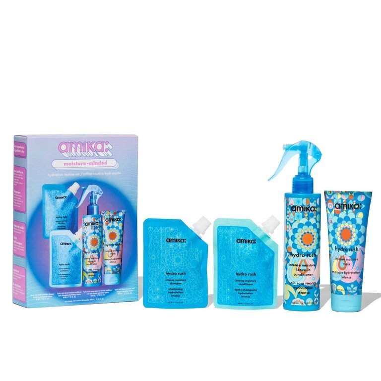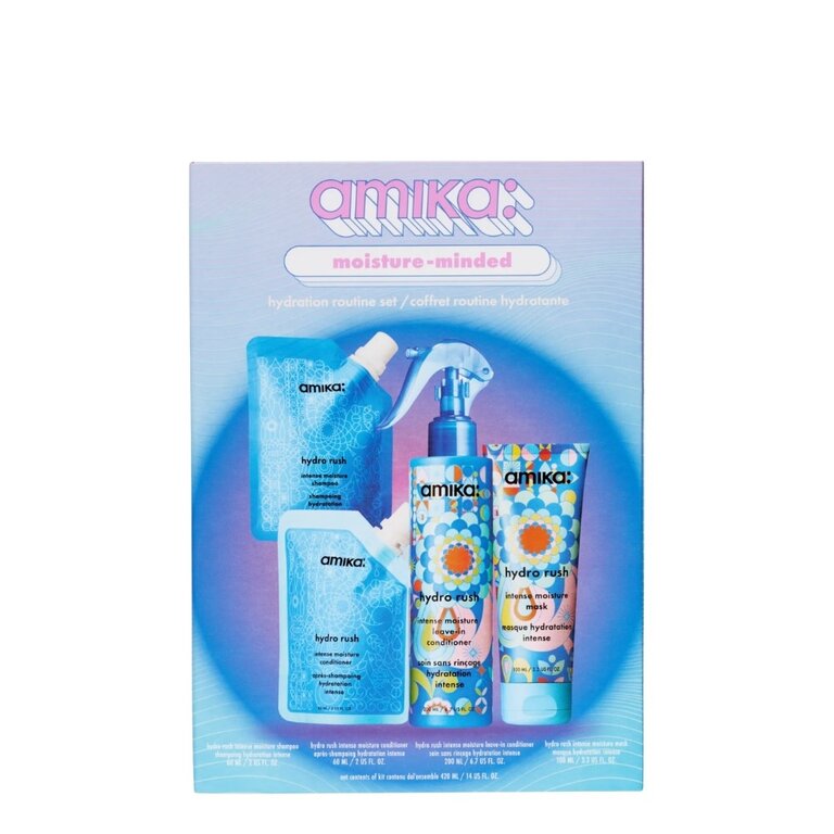 Atteignez le plus haut niveau d'hydratation capillaire avec l'ensemble "Moisture-Minded" d'Amika. Ce coffret inclut quatre essentiels désaltérants de la gamme "Hydro Rush" : les formats voyage du shampoing, du revitalisant et du masque, ainsi que le revitalisant sans rinçage en format standard.