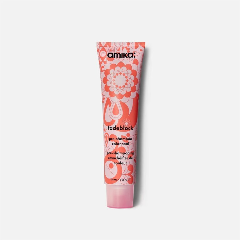 Le Pré-shampoing étanchéifier de couleur "FadeBlock" Amika protège et permet de verrouiller la couleur des cheveux pendant 10 à 12 lavages lorsqu'il est utilisé avec le shampoing, le revitalisant et le revitalisant sans rinçage Vault.