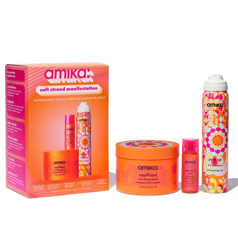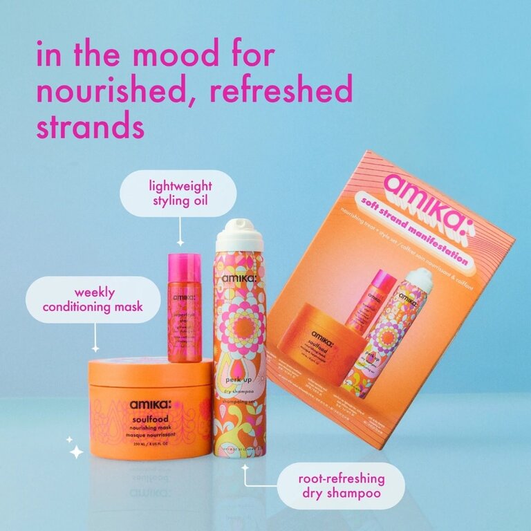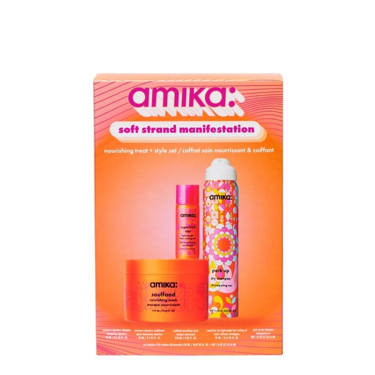 Manifestez votre crinière la plus nourrie avec le trio "Soft Strand Manifestation" d'Amika. Ce coffret exclusif comprenant un masque nourrissant "Soulfood" en format standard, des des formats voyage du shampoing sec "Perk Up" et de l'huile coiffante légère "Superfruit Star", ainsi que des échantillons de shampoing et revitalisant signature "Normcore".
