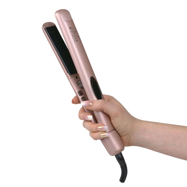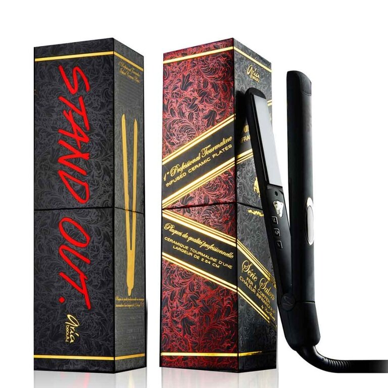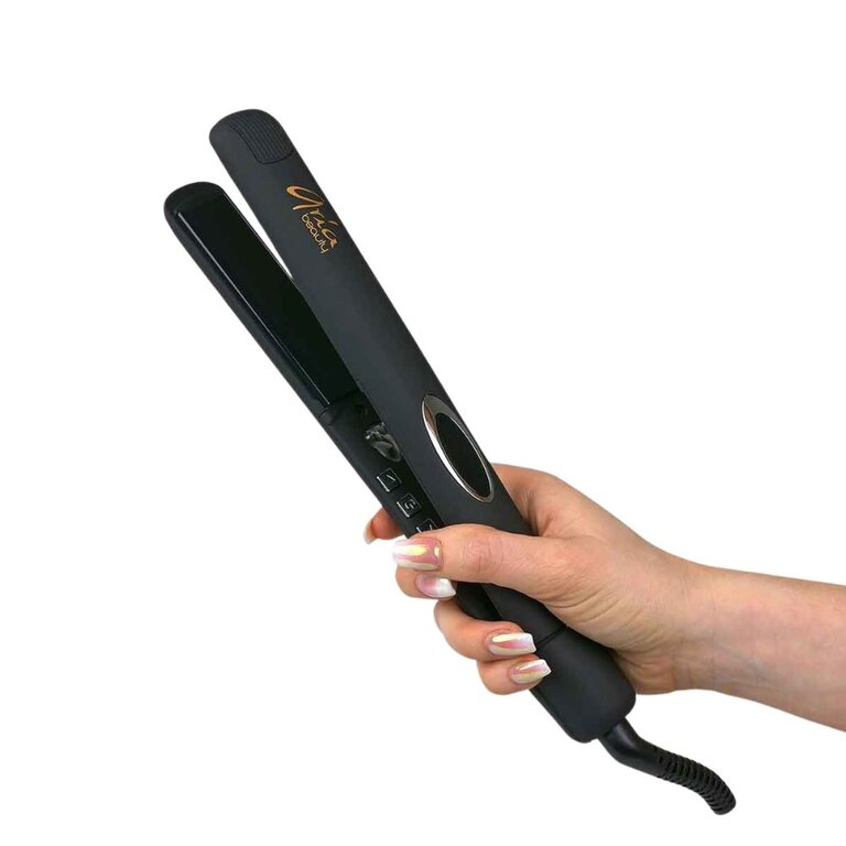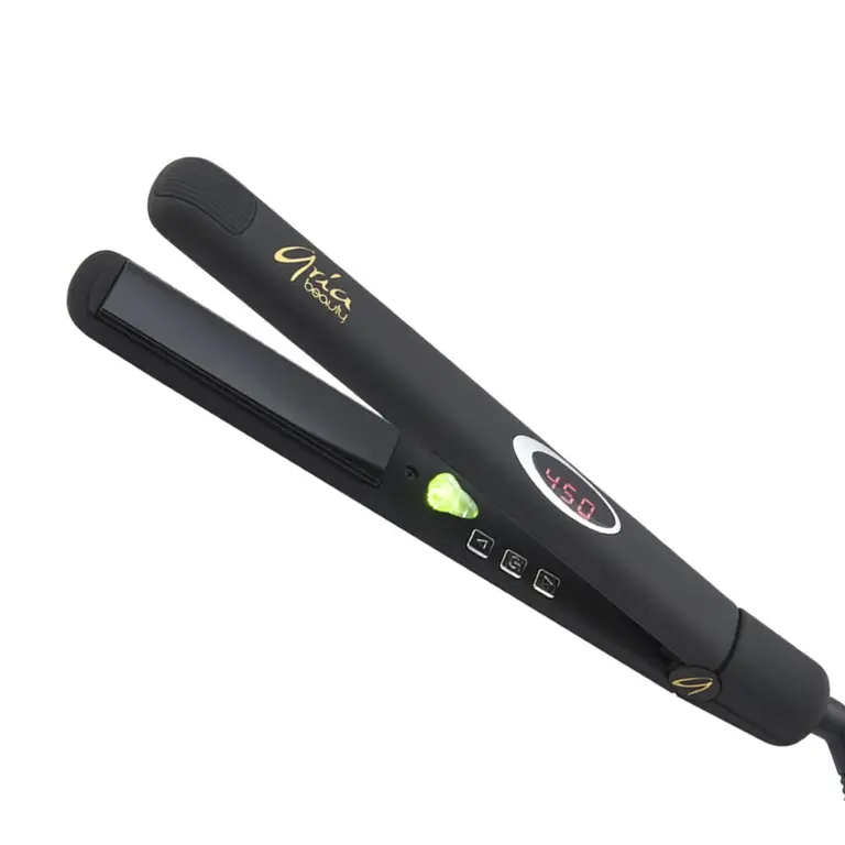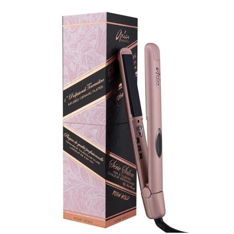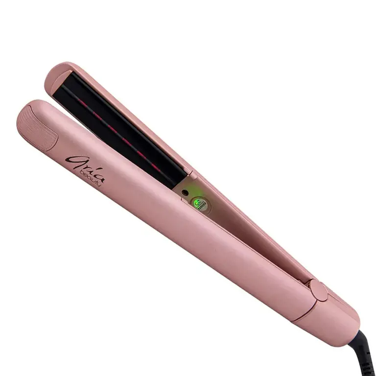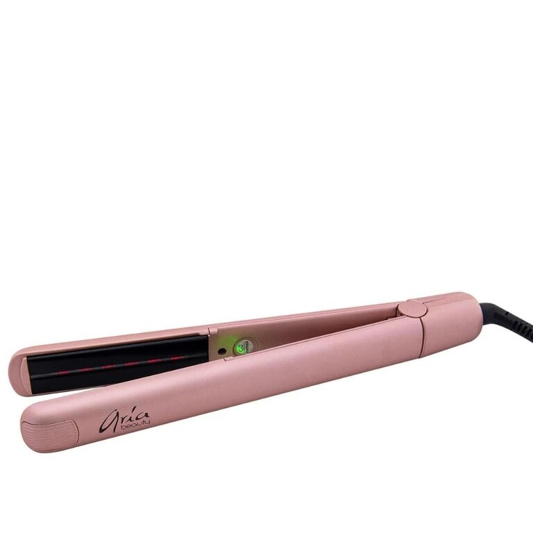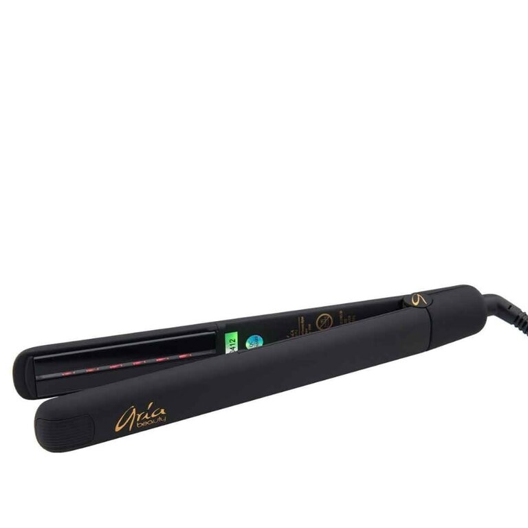 Le fer à lisser "Salon Serie Infrared Styler" de Aria Beauty. Chaleur infrarouge douce pour des cheveux soyeux. Les ions négatives permettent de respecter l'équilibre naturel des cheveux, de réduire l'électricité statique et les frisottis.