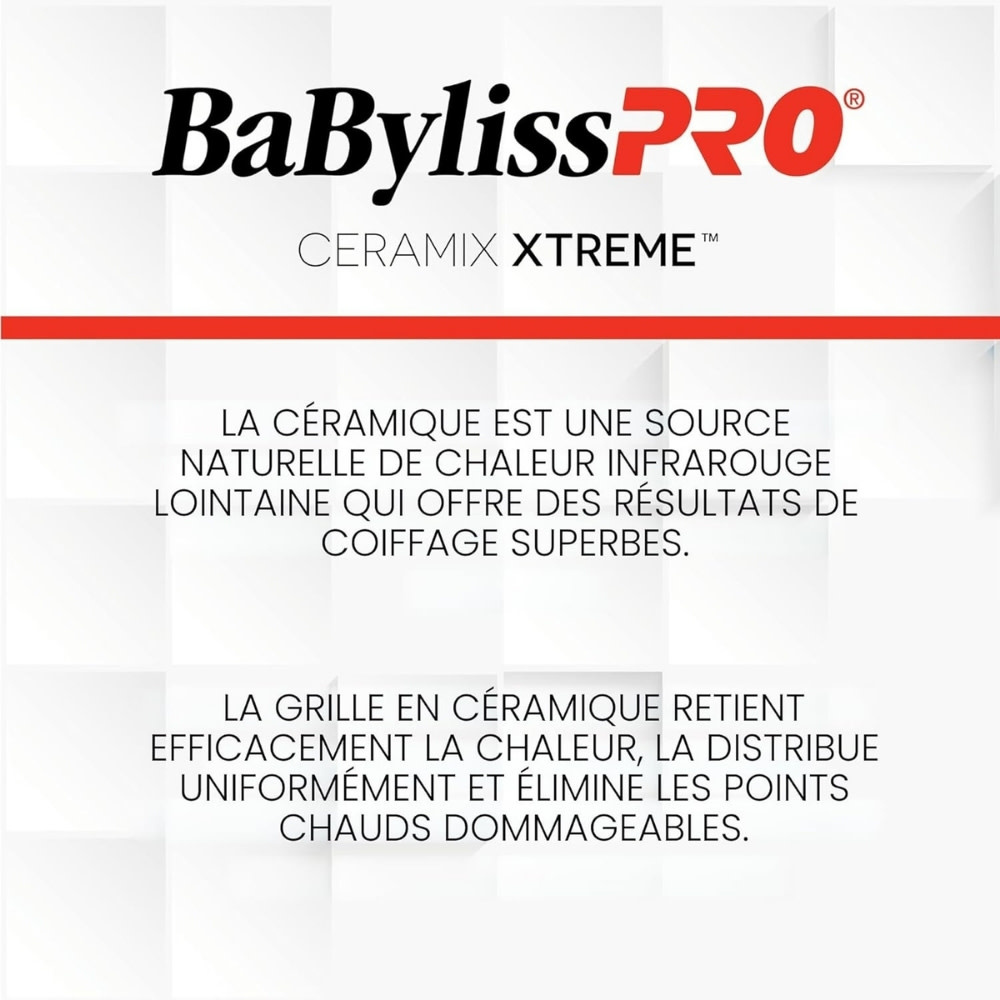 Le séchoir "Ceramix Xtreme" de BaByliss PRO combine simplicité et technologie ionique pour votre routine quotidienne. Alliant une puissance de 1750 watts à la technologie céramique, il génère une chaleur infrarouge lointaine pour sécher les cheveux de l'intérieur, protégeant ainsi leur hydratation naturelle.