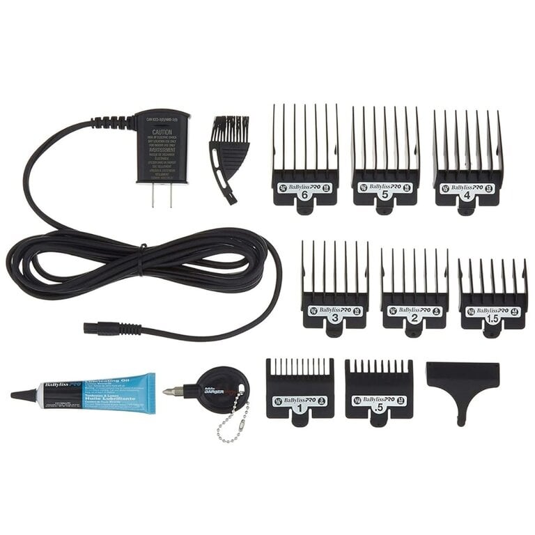 - 8 attachements de peigne: (1/16”/1.5mm), (1/8”/3mm), (3/16”/4.8mm), (1/4”/6mm), (3/8”/10mm), (1/2”/13mm), (5/8”/16mm), (3/4”/19mm)