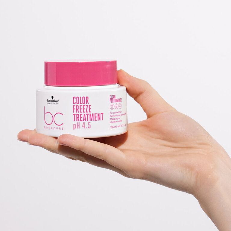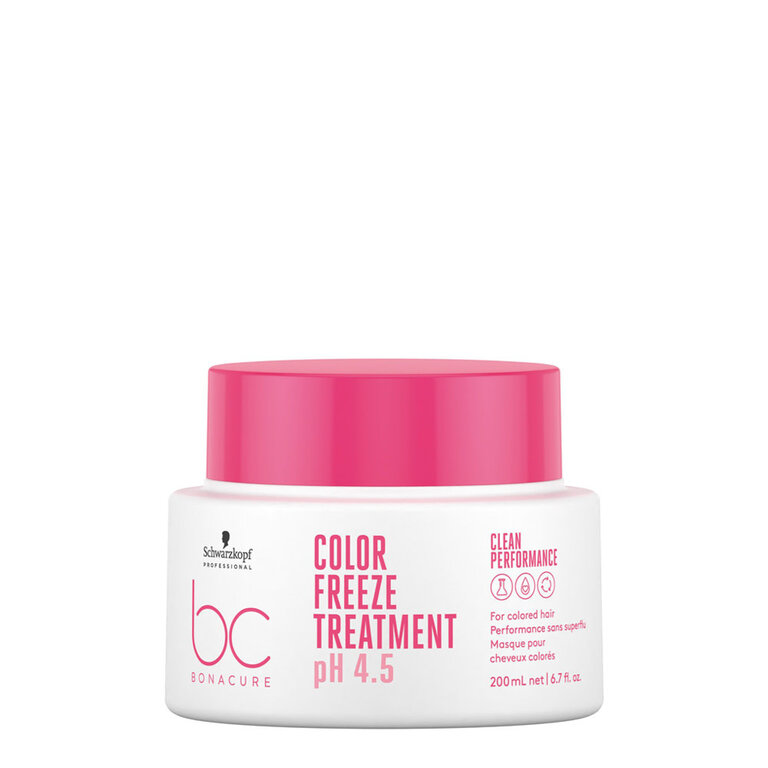 Le masque protection couleur "Color Freeze Treatment pH 4,5" de Bonacure par Schwarzkopf Professional répare intensément les cheveux colorés et éclaircis tout en lissant chacune des mèches pour éliminer les frisottis. Sa formule au pH de 4,5 aide les cheveux à atteindre leur niveau de pH optimal et à empêcher le ternissement de la couleur. Associant son complexe de soin végan et sa technologie "Cell Equalizer", les produits capillaires professionnels de la gamme "Bonacure Color Freeze" scellent parfaitement la surface du cheveu, pour une protection longue durée contre les agressions externes telles que l'eau, le soleil et la chaleur des outils chauffants. La gamme offre jusqu’à 90 % de rétention de la couleur, même après 30 shampoings.