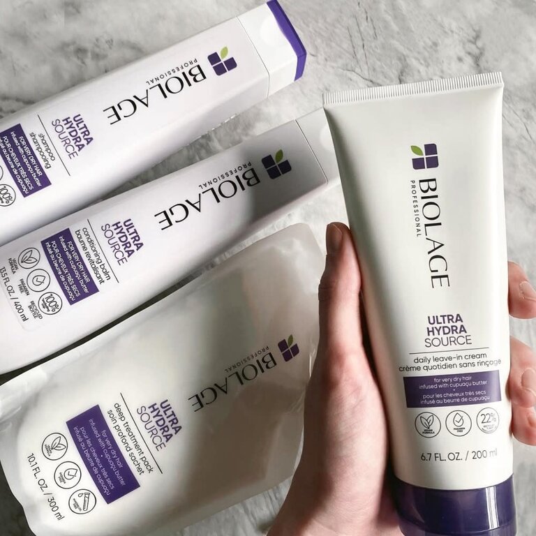 La baume quotidien sans rinçage "Ultra Hydra Source" de Biolage, fournit 72 heures de contrôle de l'humidité et des frisottis. Étanchez votre soif de beaux cheveux avec la crème quotidienne infusée au Beurre de Cupuaçu, qui est destinée aux cheveux très secs.