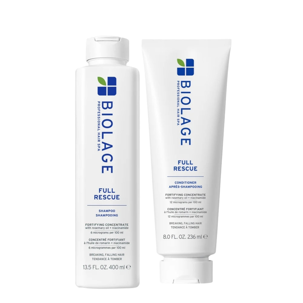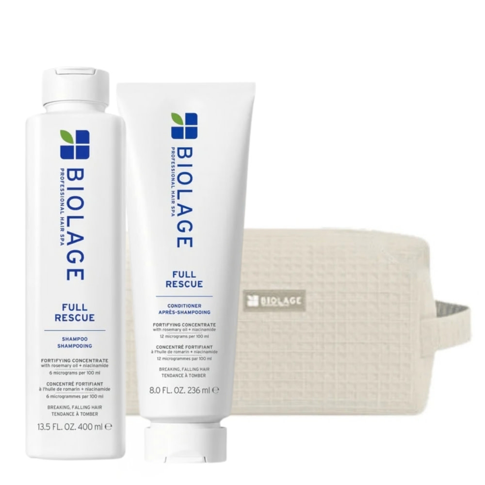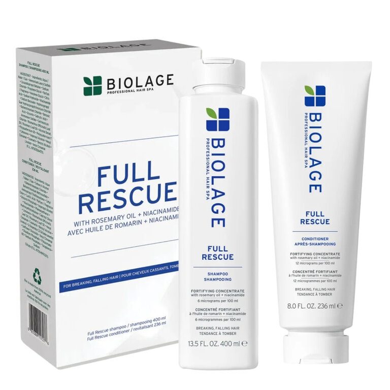 Brisez le cycle de la chute des cheveux due à la casse avec le duo fortifiant "Full Rescue" de Biolage Professional. Enrichie en huile de romarin et en niacinamide, ce rituel beauté aide à atténuer l'aspect clairsemé du cuir chevelu et prépare le terrain pour une croissance optimale, laissant vos cheveux visiblement plus volumineux et jusqu'à 74 % plus résistants à la casse.