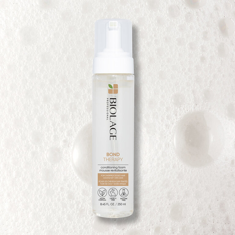 La mousse revitalisante pour cheveux surtraités et abîmés "Bond Therapy" de Biolage Professional est un après-shampoing moussant crémeux et léger, pour les cheveux fins, qui hydrate, démêle et crée des liaisons de l'intérieur vers l'extérieur du cheveu. Sa formule infusée d'huile de noix de coco et d'acide citrique nourrit les cheveux et renforce les liaisons affaiblies, laissant les mèches moins cassantes, plus fortes et plus douces, sans rendre les cheveux plats.
