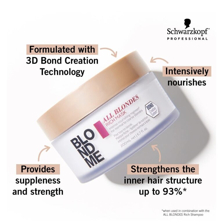Le masque riche "BlondMe" est un traitement capillaire profondément nourrissant développé pour les types de cheveux blonds moyens à épais, éclaircis ou naturels. Il agit sur la structure interne et externe des cheveux pour assurer un soin complet.