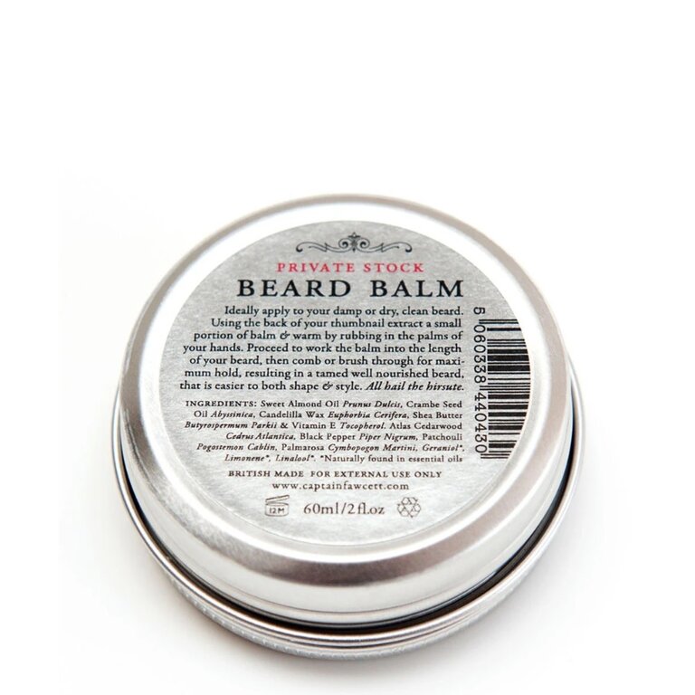 En utilisant le parfum "Private Stock" du Captain (le même que pour son huile à barbe et sa cire à moustache primée) nous avons créé un baume à barbe tout simplement splendide, une véritable fusion de 5 crèmes de base et de cires exotiques avec du bois de cèdre, du poivre noir, du patchouli et des huiles essentielles de Palma Rosa.
