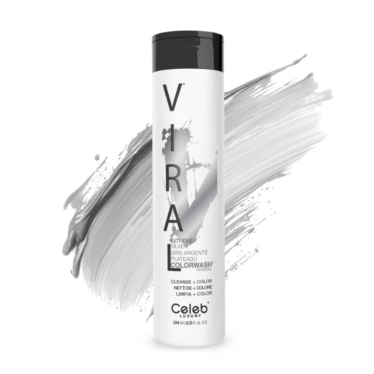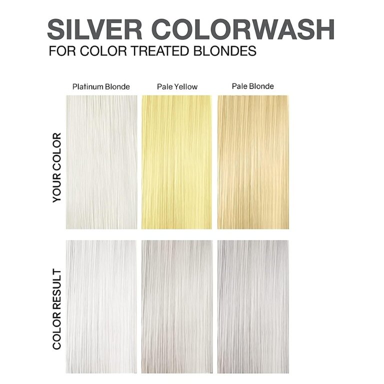 Le Shampoing nettoyant et colorant semi-permanent Viral Colorwash dépose un pigment de couleur argent sur des cheveux pré-éclaircis et blond clair pour créer une nouvelle couleur, maintenir ou rafraîchir la couleur grise.