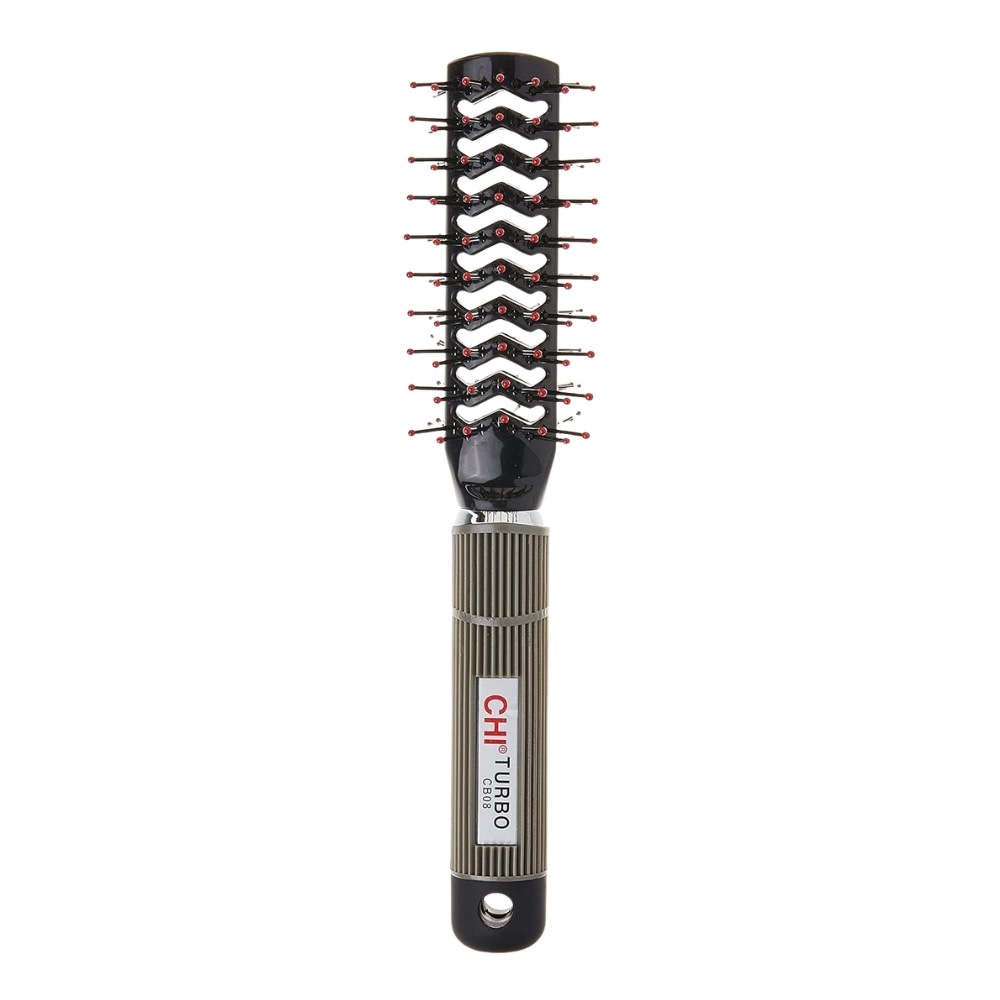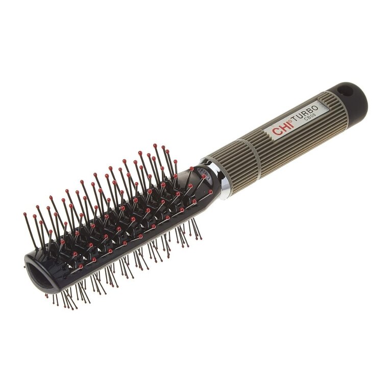 La brosse CHI ventilée à 2 côtés "Turbo" est une brosse à double face conçue pour accélérer le séchage et faciliter le coiffage. Grâce à ses ouvertures des deux côtés, l’air du séchoir circule mieux, ce qui réduit le temps de séchage. Ses poils en nylon à embouts arrondis combinent différentes longueurs pour offrir à la fois volume aux racines, bonne prise sur les mèches et démêlage en douceur. Légère et munie d’une poignée antidérapante, elle convient particulièrement aux cheveux courts à mi-longs et permet un brushing rapide, efficace et confortable.
