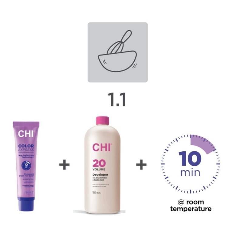 - Technologie "Hue Definition" : CHI Color Express est doté de la technologie "Hue Definition" qui intègre un puissant mélange d'ingrédients hautement performants tels que l'aloe vera, l'acide hyaluronique et la protéine de soie. Cette combinaison unique favorise une hydratation intense, prolonge la longévité de la couleur, améliore la brillance et renforce les cheveux, préservant ainsi leur intégrité pendant les services chimiques et prévenant toute fragilité potentielle.