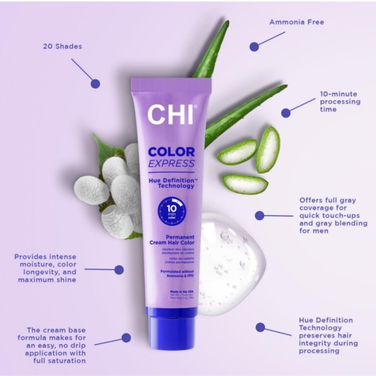 - Technologie "Hue Definition" : CHI Color Express est doté de la technologie "Hue Definition" qui intègre un puissant mélange d'ingrédients hautement performants tels que l'aloe vera, l'acide hyaluronique et la protéine de soie. Cette combinaison unique favorise une hydratation intense, prolonge la longévité de la couleur, améliore la brillance et renforce les cheveux, préservant ainsi leur intégrité pendant les services chimiques et prévenant toute fragilité potentielle.