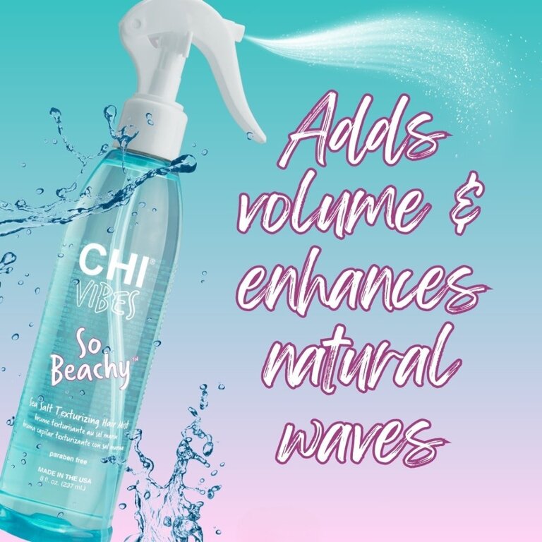 La brume texturisante au sel marin "So Beachy" de CHI Vibes est spécialement conçu pour reproduire des ondulations de plage, sans effort. Formulée de sel marin, elle aide à créer des vagues naturelles et texturées, au volume subtil et à la tenue souple.