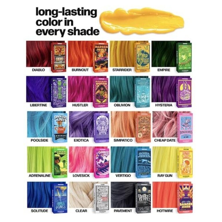 La coloration semi-permanente Danger Jones offre 25 nuances vibrantes. Toutes les couleurs sont mélangeables pour des résultats de couleurs personnalisés. Sa texture crémeuse unique facilite l'application et la saturation des cheveux, ce qui signifie que vous utilisez moins de produit pour obtenir une couverture complète. De plus, toutes les couleurs sont hautement pigmentées, ce qui leur donne un éclat audacieux. Même les pastels ont du cran.