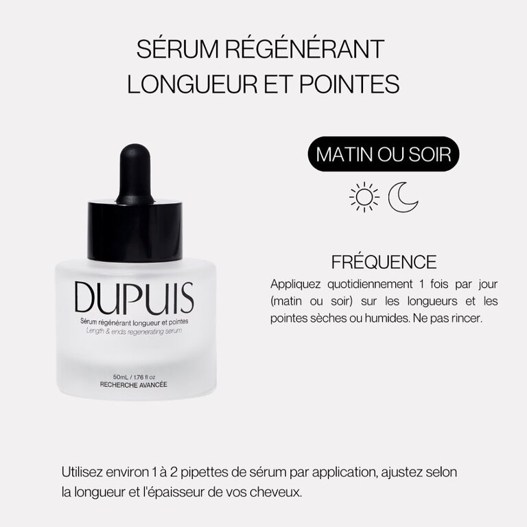 Pour des résultats optimaux, utilisez la brosse stimulante pour cuir chevelu Dupuis afin de bien répartir le sérum sur vos longueurs et pointes. Cela assure une meilleure absorption du produit, pour une hydratation et une performance maximales.