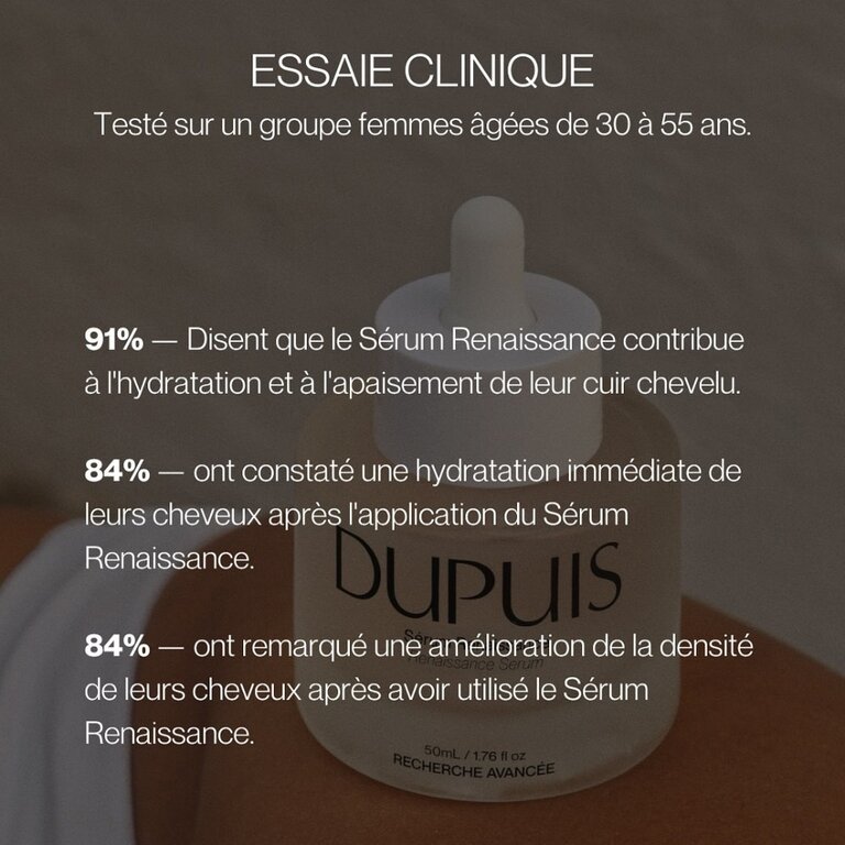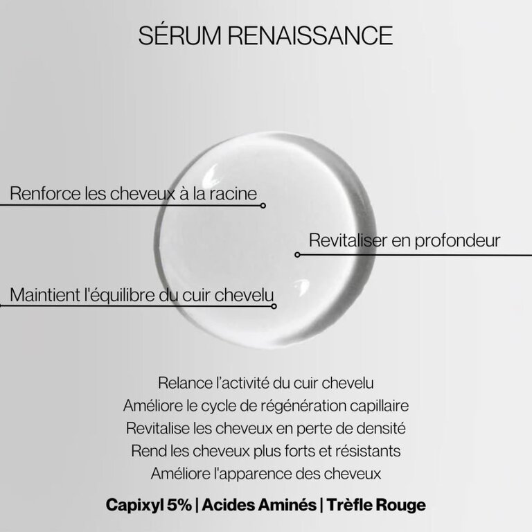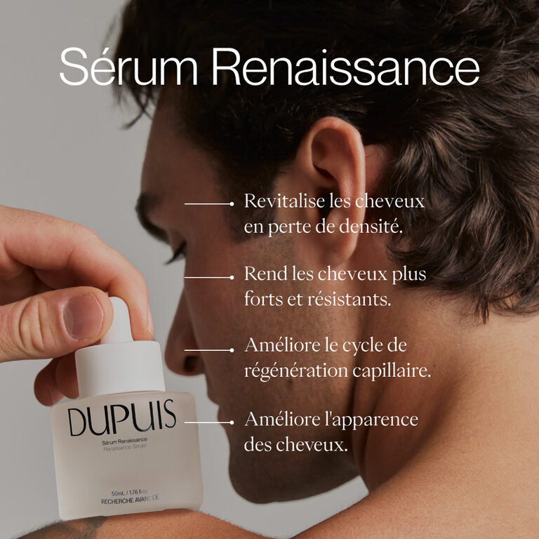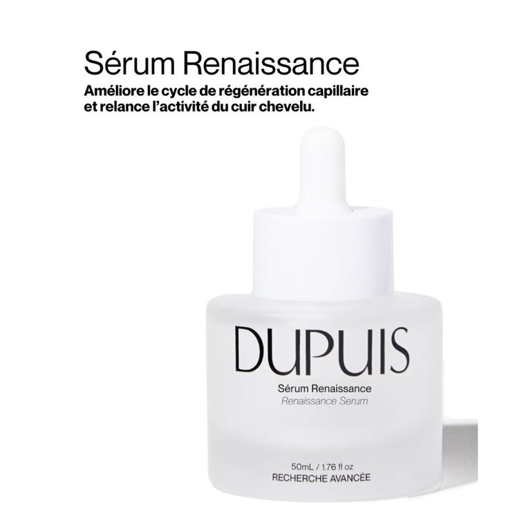 Le sérum renaissance par Dupuis incarne l'alliance parfaite entre technologies avancées et formulations de pointe pour offrir un renouvellement capillaire complet. Précisément conçu pour agir en profondeur, ce soin d'exception renforce les cheveux dès la racine, maintient l'équilibre du cuir chevelu et le revitalise en profondeur.