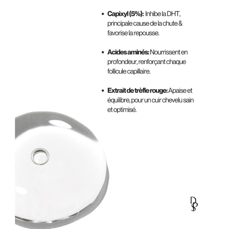 - Capixyl 5% : Grâce à ses puissants peptides biomimétiques et extraits de trèfle rouge, le Capixyl 5% agit en synergie pour optimiser le cycle de renouvellement des cheveux. Cette formulation avancée soutient activement une régénération capillaire optimale pour une chevelure visiblement plus saine et plus dense.