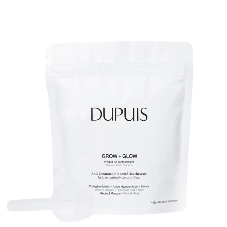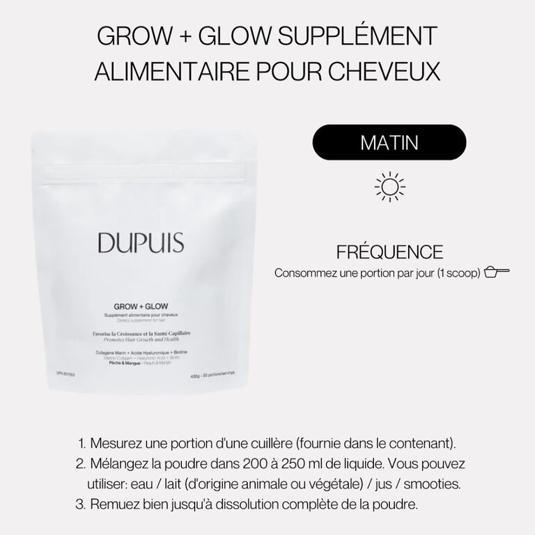 Élevez votre rituel beauté avec "Grow + Glow" par Dupuis, le supplément alimentaire qui révèle la brillance naturelle de vos cheveux tout en les renforçant de l’intérieur.