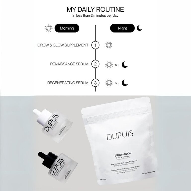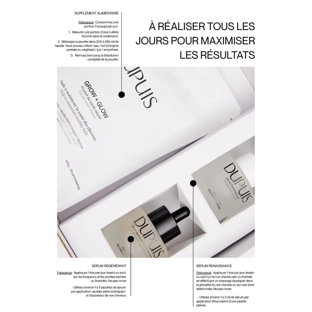 Il intègre stratégiquement le supplément alimentaire "Grow & Glow", le sérum renaissance pour le cuir chevelu et le sérum régénérant longueurs et pointes, vous offrant une solution complète pour des cheveux résistants et d'apparence plus saine.