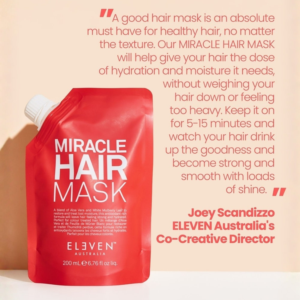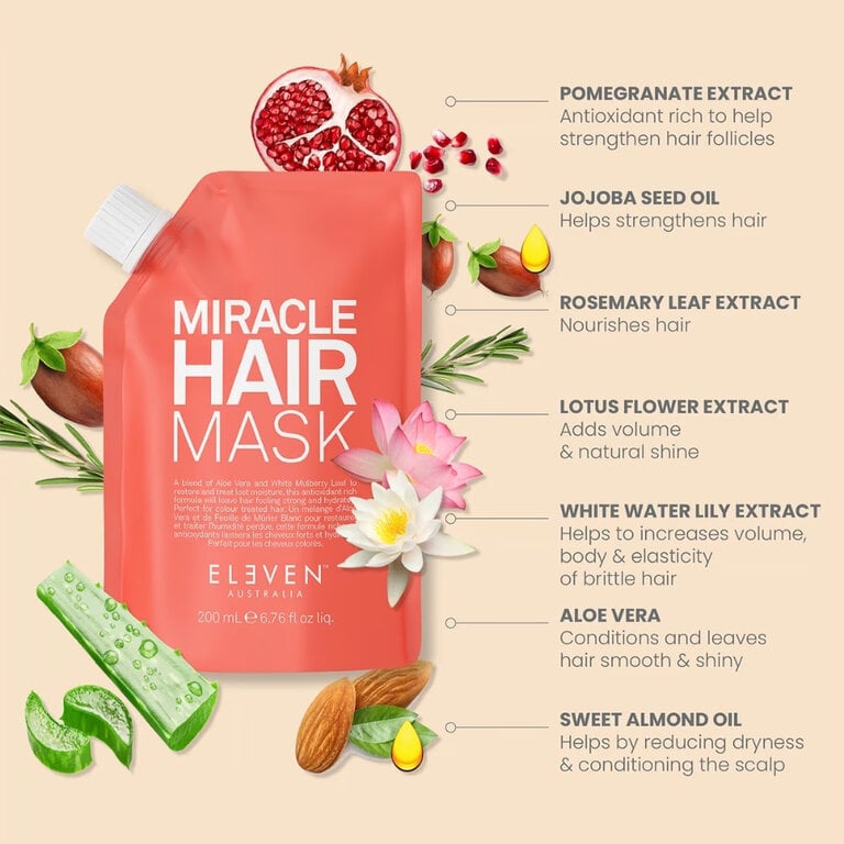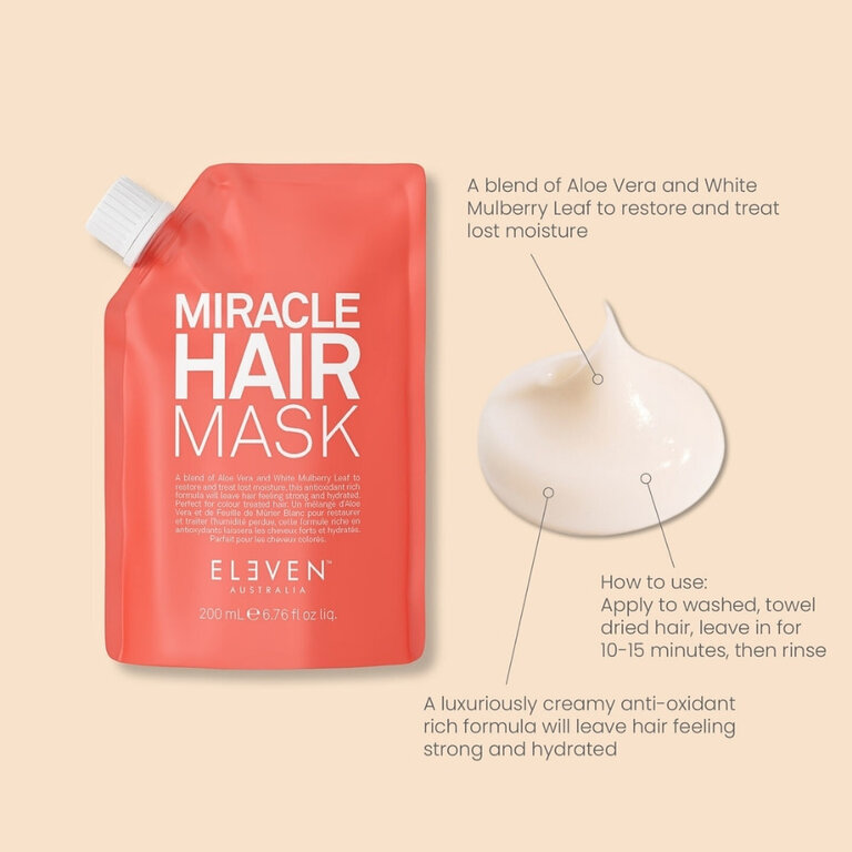 Le masque traitant miracle "Miracle Hair Mask" d'Eleven Australia offre une transformation visible pour les crinières assoiffées. Il s'agit d'un soin d'une richesse exquise qui se fond dans la chevelure pour offrir une dose de force et d'hydratation immédiate et durable. Sa formule est spécialement conçue pour saturer chaque mèche en nutriments essentiels, faisant ainsi disparaître l'aspect rêche et terne typique des cheveux déshydratés. Dès le rinçage, la chevelure affiche une douceur soyeuse, une brillance ravivée, et une maniabilité nettement améliorée, sans aucun résidu lourd.