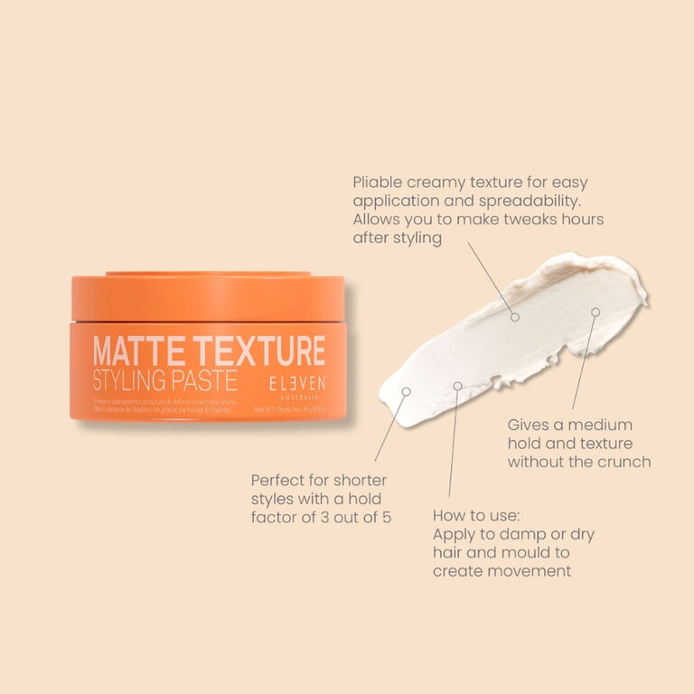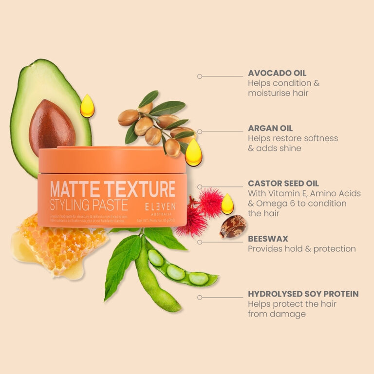 Créez un look texturé et décontracté avec la pâte modelante "Matte Texture Styling Paste" d'Eleven Australia. Elle procure une tenue moyenne et souple, essentielle pour un style qui demeure malléable et ne fige jamais. En prime, elle assure une finition parfaitement matte et naturelle, éliminant toute brillance indésirable. Cette performance est soutenue par une formule enrichie d'ingrédients naturels, notamment la cire d'abeille et l'huile de ricin, qui travaillent de concert pour vous offrir une définition flexible et facilement remodelable.