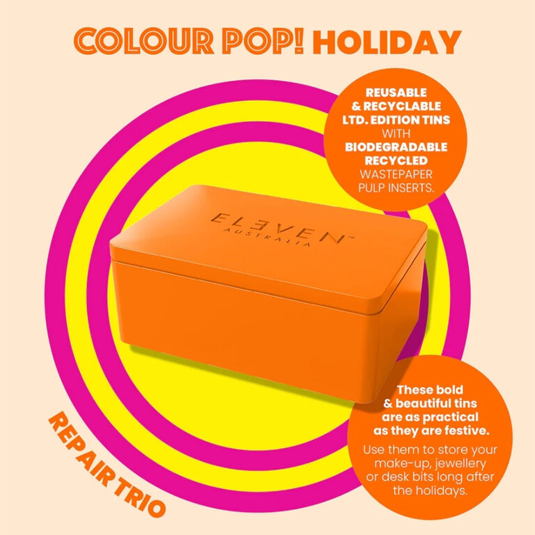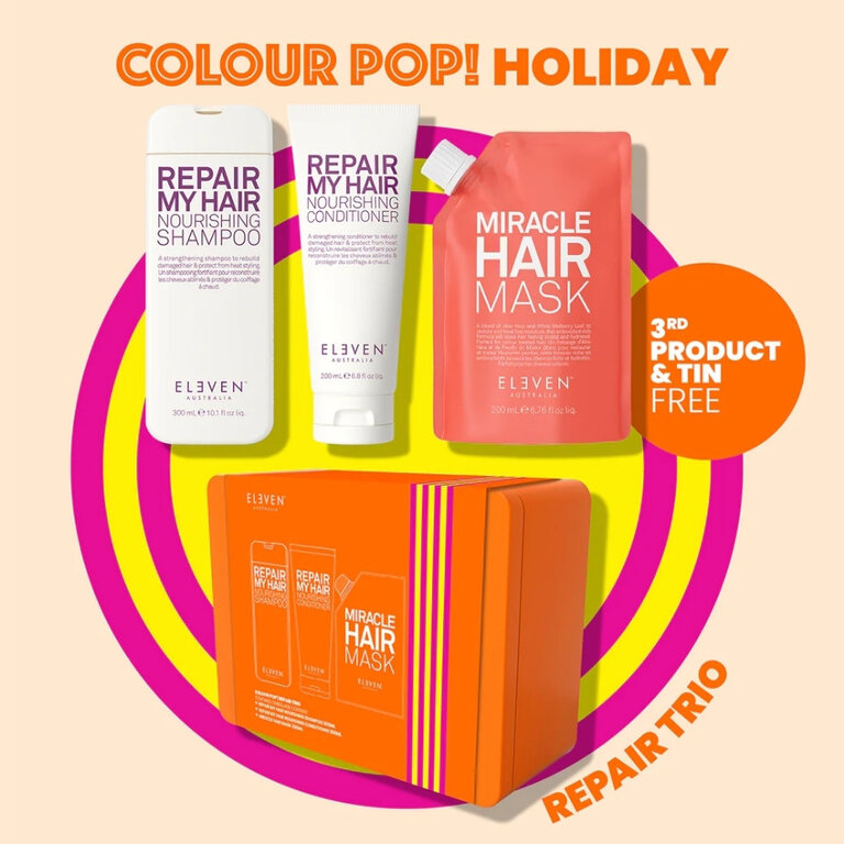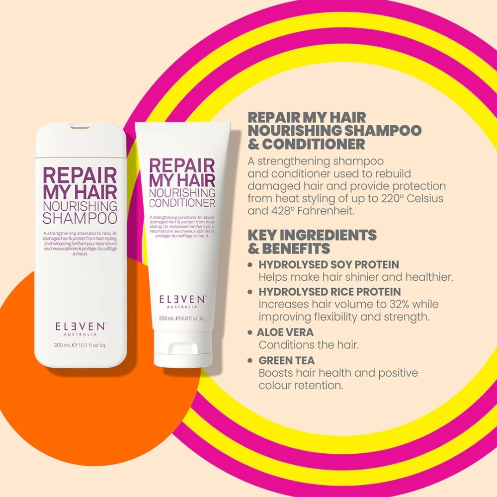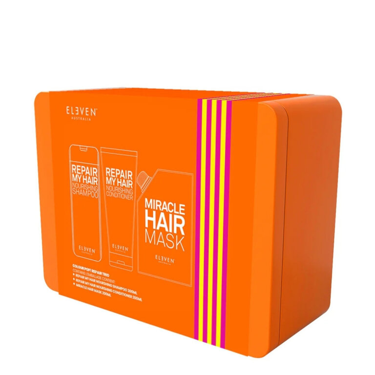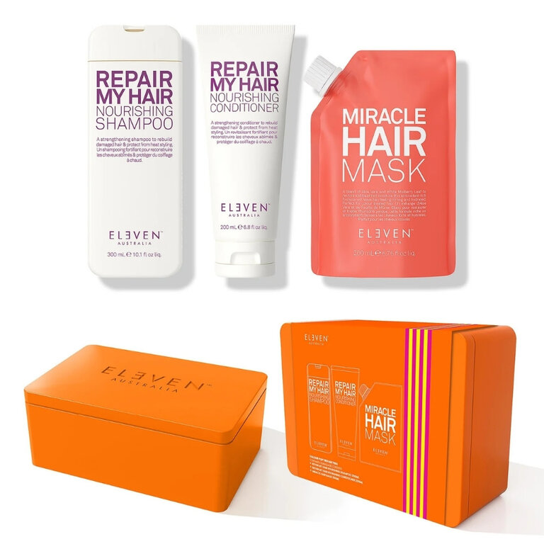 Rétablissez la santé de votre chevelure grâce trio réparateur "Repair My Hair" d'Eleven Australia. Composé d'un shampoing, d'un revitalisant et d'un masque, ce rituel beauté fortifie la fibre capillaire et protège de la chaleur des outils coiffants jusqu'à (428°F/220°C). Il contribue ainsi à restaurer l'élasticité naturelle des cheveux, leur force et leur résistance face aux dommages futures.