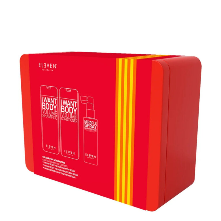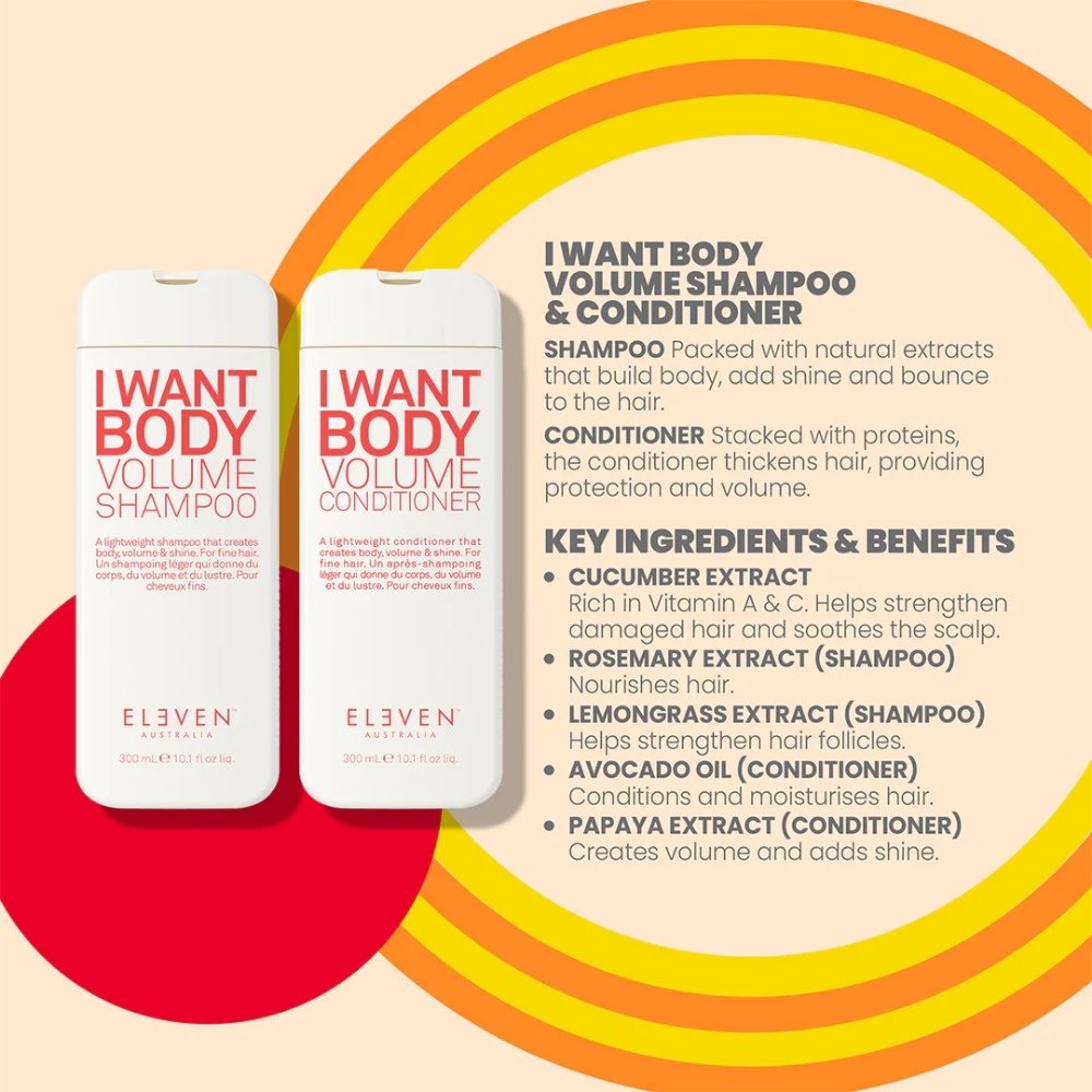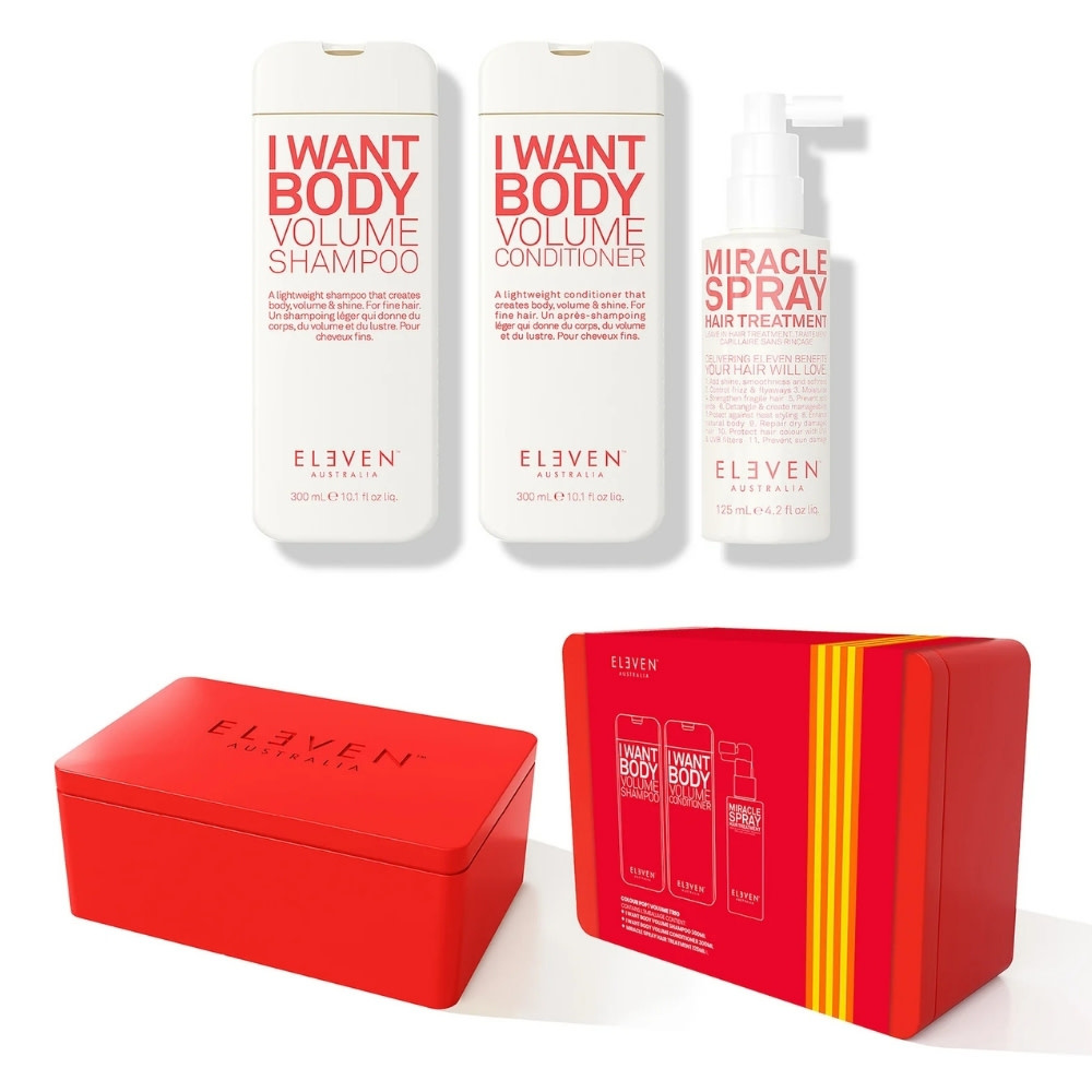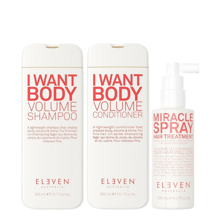 Injectez de la densité et du rebond à vos cheveux fins grâce au trio "I Want Body" d'Eleven Australia. Composé d'un shampoing, d'un revitalisant et d'un traitement sans rinçage léger, cet ensemble fortifie les mèches de l'intérieur, pour des cheveux visiblement plus épais, plus denses et un volume qui dure.