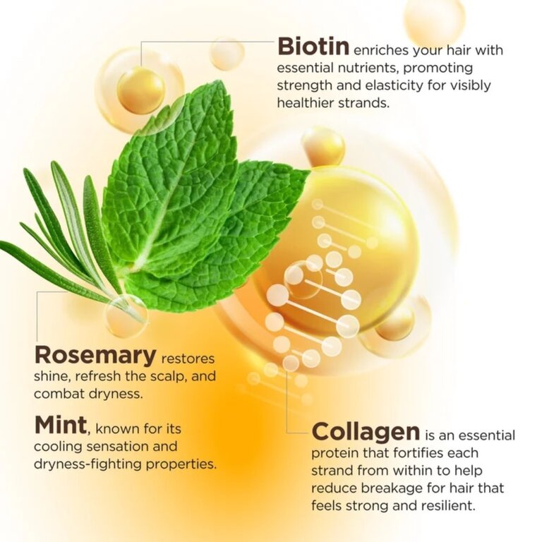 - Collagène : Aide à renforcer la structure des cheveux et à améliorer leur élasticité. Dans ce produit, il contribue à rendre les cheveux plus résistants, plus épais en apparence et moins sujets à la casse, tout en leur apportant douceur et souplesse.