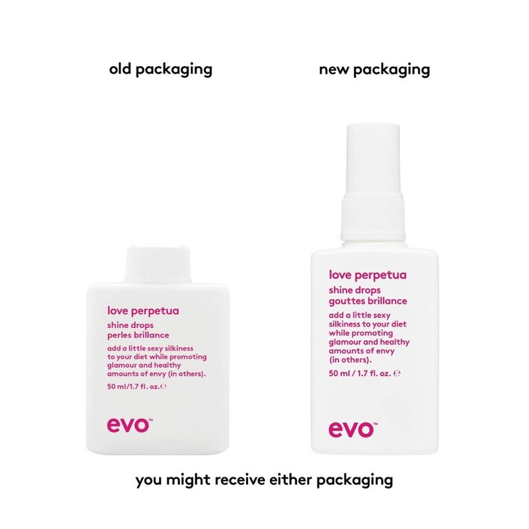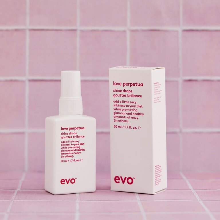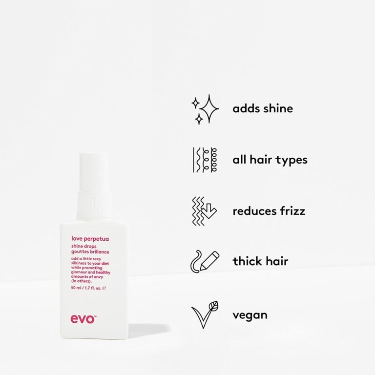 Les gouttes de brillance "Love Perpetua Shine Drops" d'Evo scellent la cuticule, polissent et subliment les cheveux pour une finition haute brillance sans frisottis. Elles protègent la fibre capillaire contre la perte d'hydratation et créent un bouclier anti-humidité. Les cheveux sont instantanément plus faciles à démêler et à coiffer, gagnent en glissance pour un brossage et une mise en plis simplifiés. Les cheveux sont ainsi lisses, doux, faciles à manipuler et visiblement plus lustrés.