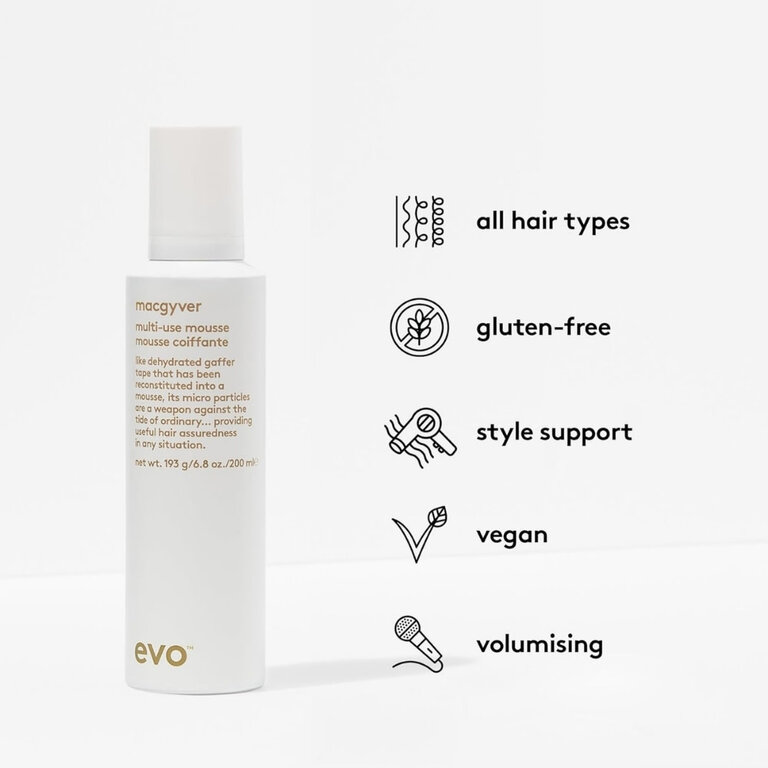 Exploitez une polyvalence maximale avec la mousse coiffante "Macgyver" d'Evo, une formule stylisante capable de créer volume, séparation et texture, qu'elle soit appliquée sur cheveux humides ou secs, avec ou sans chaleur. Sa composition assure une tenue moyenne qui décuple le corps et le mouvement, tout en conservant la souplesse et le toucher agréable des cheveux. Elle intègre une mémoire de forme durable, adaptée à une large gamme de coiffures, des plus lisses aux plus bouclées.