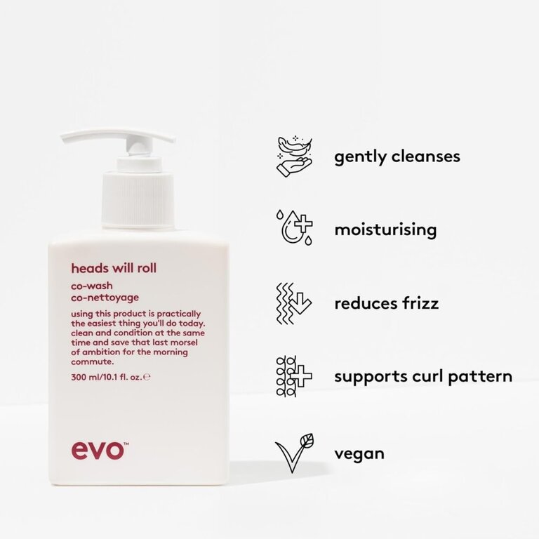 Le revitalisant co-nettoyage "Heads Will Roll" par Evo un après-shampoing nettoyant peu moussant qui lave et conditionne en douceur en une seule étape pour éliminer les accumulations, hydrater et améliorer la maniabilité des boucles. Sa formule enrichie de quinoa hydrolysé renforce et protège les boucles tout en conservant l'éclat de la couleur tandis que l'huile de graines de jojoba nourrit, hydrate, adoucit et réduit les frisottis indésirables. Infusé d'huile d'avocat, ce soin ajoute une action antioxydante qui protège les mèches et maintien leur hydratation naturelle. Les boucles sont légères, hydratées et plus faciles à coiffer.