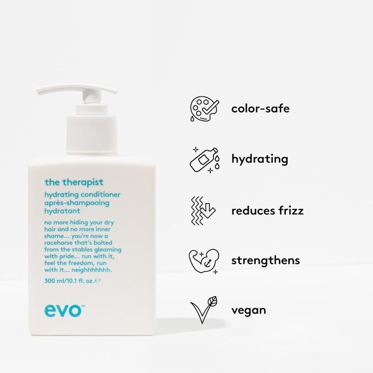 Le revitalisant hydratant "The Therapist" d'Evo est un soin hydratant conçu pour optimiser l'état des cheveux secs et déshydratés. Sa formulation avancée intègre de la glycérine et du panthénol pour nourrir la cuticule, ce qui diminue les frisottis et offre une résistance accrue à l'humidité. L'ajout de quinoa hydrolysé agit comme un bouclier protecteur, renforçant la fibre capillaire et prolongeant la tenue des pigments de couleur. Vos cheveux sont soyeux, doux, nourris et parfaitement maniables.