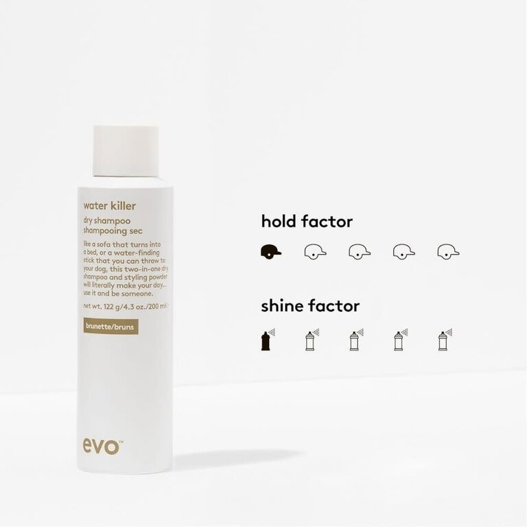Optimisez l'apparence de vos cheveux bruns entre les lavages avec le shampoing sec brunette "Water killer" d'Evo. Conçu spécifiquement pour les tons foncés, ce puissant 2-en-1 rafraîchit l'apparence et l'odeur des cheveux tout en augmentant instantanément leur corps. Son secret réside dans sa pigmentation brune qui non seulement s'harmonise parfaitement avec les teintes profondes, mais masque également les racines et la repousse de manière naturelle et discrète, vous assurant une apparence soignée sans effort.