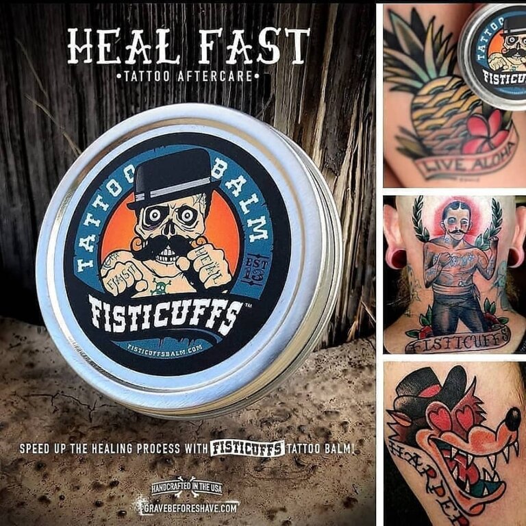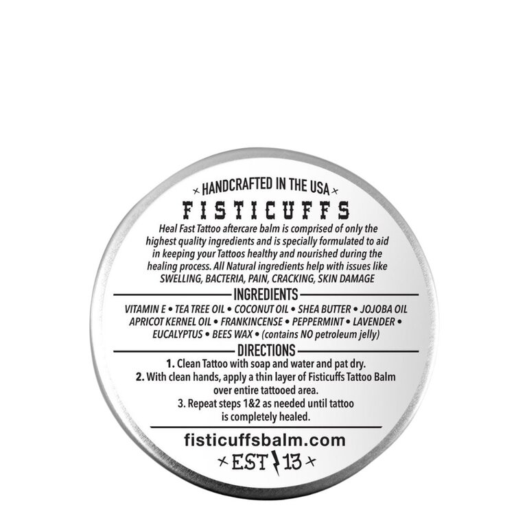 Le baume de soin pour tatouage "Tattoo Balm Heal Fast Tattoo" de Fisticuffsest composé uniquement d'ingrédients de la plus haute qualité et est spécialement formulé pour aider à garder vos tatouages en bonne santé et nourris pendant le processus de guérison.