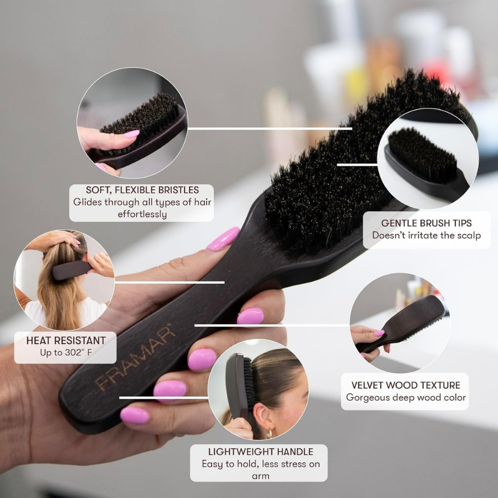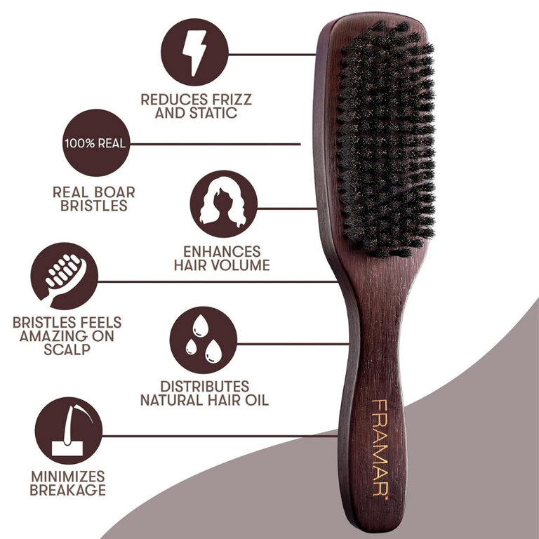 Atteignez la perfection dans vos coiffures lissées avec la brosse en poils de sanglier "Boar Brush" de Framar, l'outil essentiel pour une finition lustrée et sans défaut. Cette brosse fournit la tension essentielle pour dompter les mèches rebelles et les frisottis tenaces, créant la surface ultra-lisse recherchée pour les chignons et les queues de cheval plaquées. Ses poils de sanglier 100% naturels travaillent activement pour polir la cuticule et distribuer les huiles naturelles du cuir chevelu sur toute la longueur, ajoutant une brillance naturelle à chaque coup de brosse.
