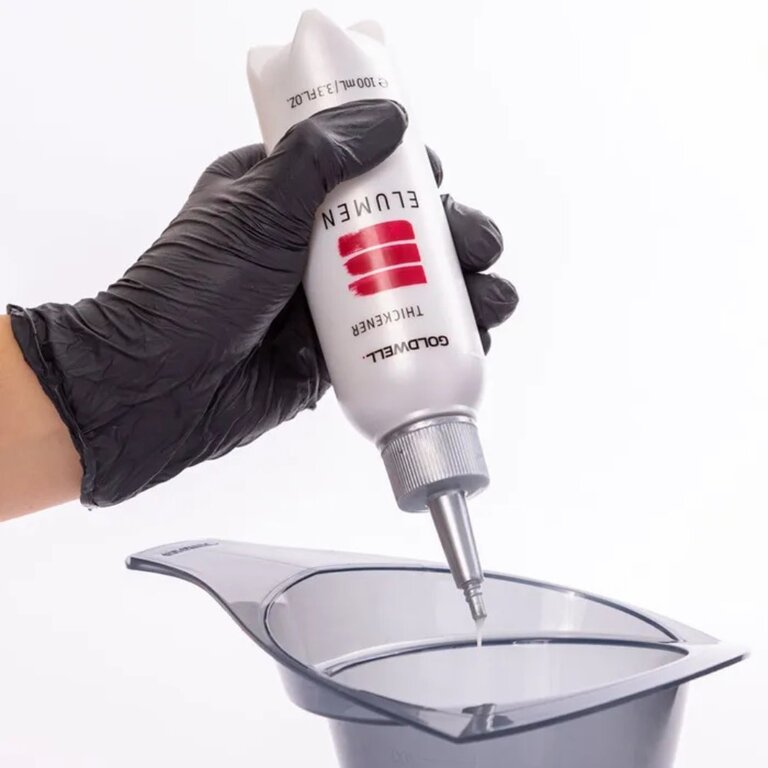 Le liquide épaississant "Thickener" de Goldwell est spécialement conçu pour les colorations capillaires Elumen. Il ne s’agit pas d’une coloration à part entière, mais d’un additif qui modifie et épaissit la texture de la formule Elumen pour faciliter l’application. Ce qui permet une application plus précise, notamment lors de techniques créatives pour éviter que les couleurs ne se mélangent ou ne coulent.