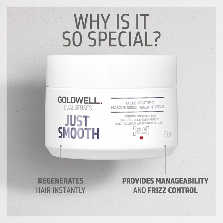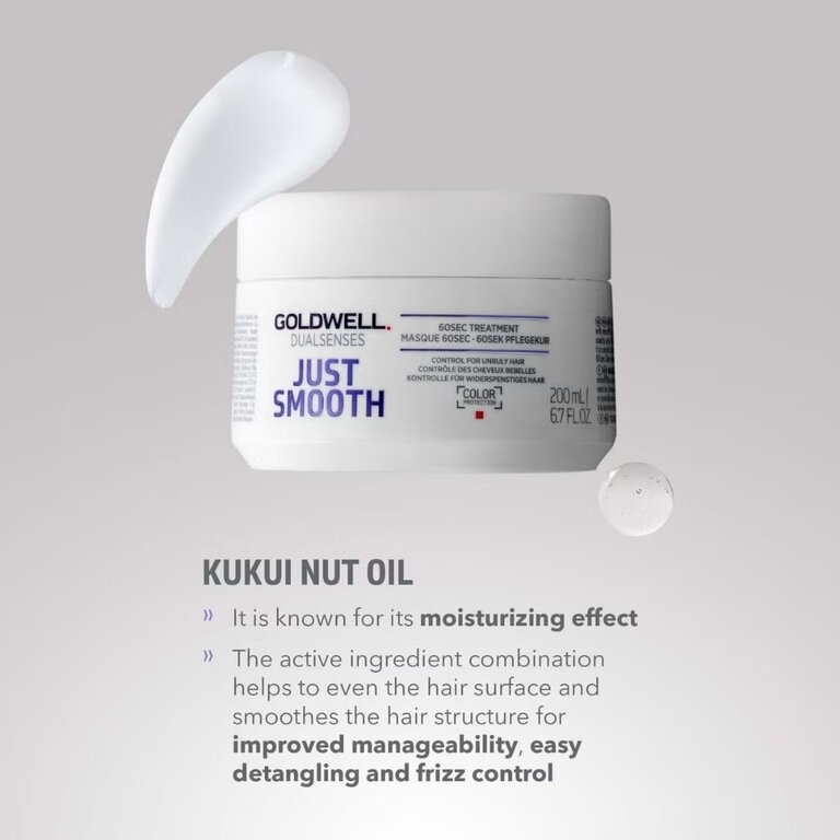 Le masque disciplinant 60sec "Just Smooth" de Goldwell Dualsenses fournit une maniabilité et un contrôle des frisottis, en plus de régénérer les cheveux jusqu'à 100%, en seulement 60 secondes. Sa formule infusée d'huile hydratante de noix de Kuikui unifie la structure des cheveux indisciplinés et crépus, pour des mèches plus lisses, plus faciles à coiffer, ultra démêler et sans mèches rebelles.