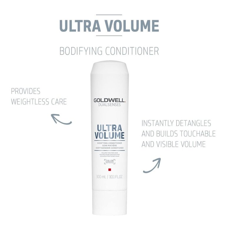 Offrez à vos cheveux un gain de volume et d'éclat instantané avec le revitalisant matière corporisant "Ultra Volume" de Goldwell Dualsenses.