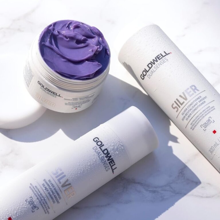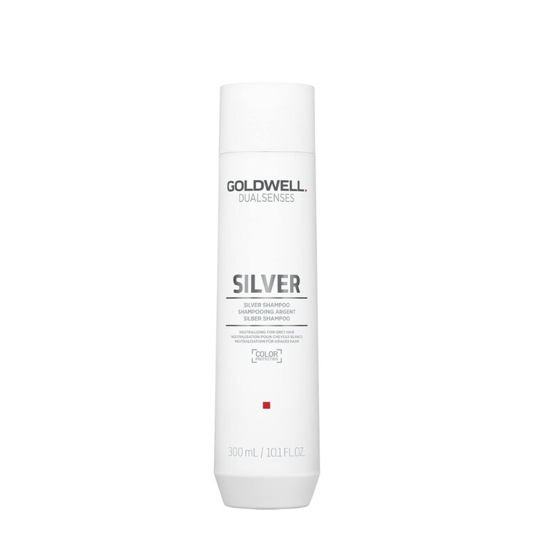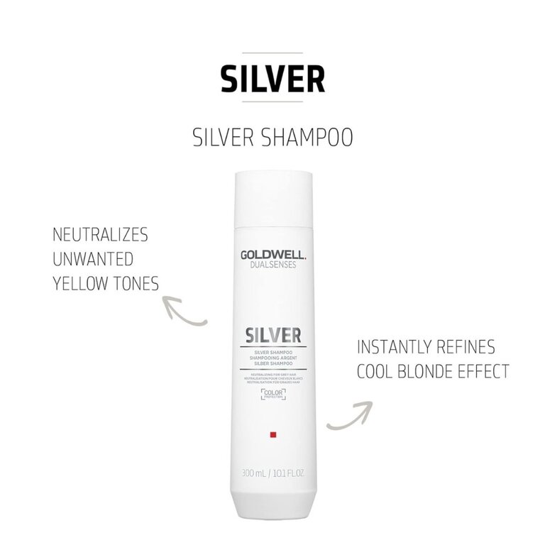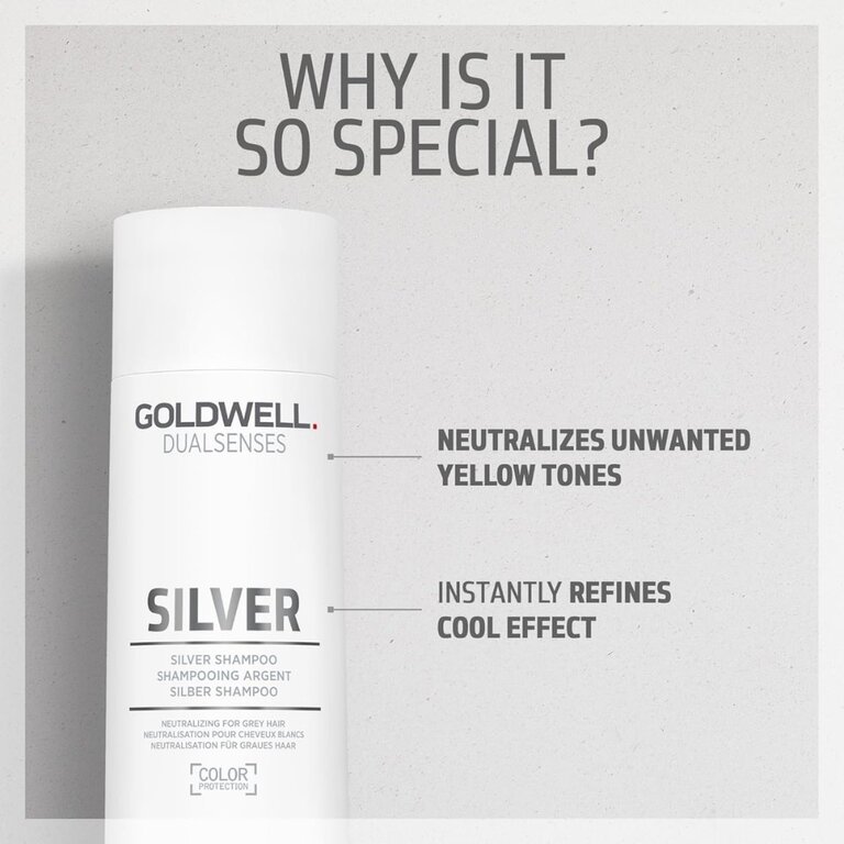 Le shampoing argent "Silver" de Goldwell Dualsenses neutralise les tons jaunes indésirables des cheveux argentés et blonds froids pour garantir que la couleur de cheveux reste éclatante et impeccable. Aussi douce que l'eau, sa formule comprend l'unique technologie "FadeStopFormula" qui minimise considérablement l'affadissement de la couleur, pour des reflets protégés à chaque lavage. Dans le but d'optimiser au maximum la brillance, ses actifs transforment la lumière UV non visible en lumière visible pour une brillance magnifique amplifiée. Les cheveux sont lustrés, protégés et sains.